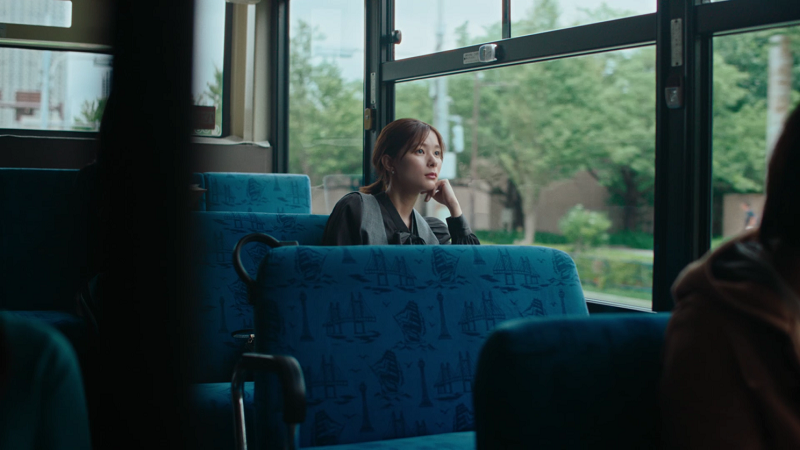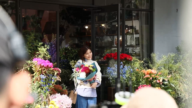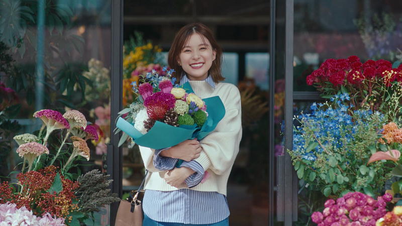 ピンクのニットを着て軽やかな足取りで街に飛び出し、ショーウィンドウに映る自身の姿を見て嬉しそうに微笑んだり、赤のニットを着て友達と写真を撮ったり、キナリのニットを着てバスに乗り、初めてのバス停で降りてみたことで素敵なお花屋さんを見つけたり。お気に入りの服に出会ったことで、芳根さんの日常もカラフルに色づいていくのが見どころだ。