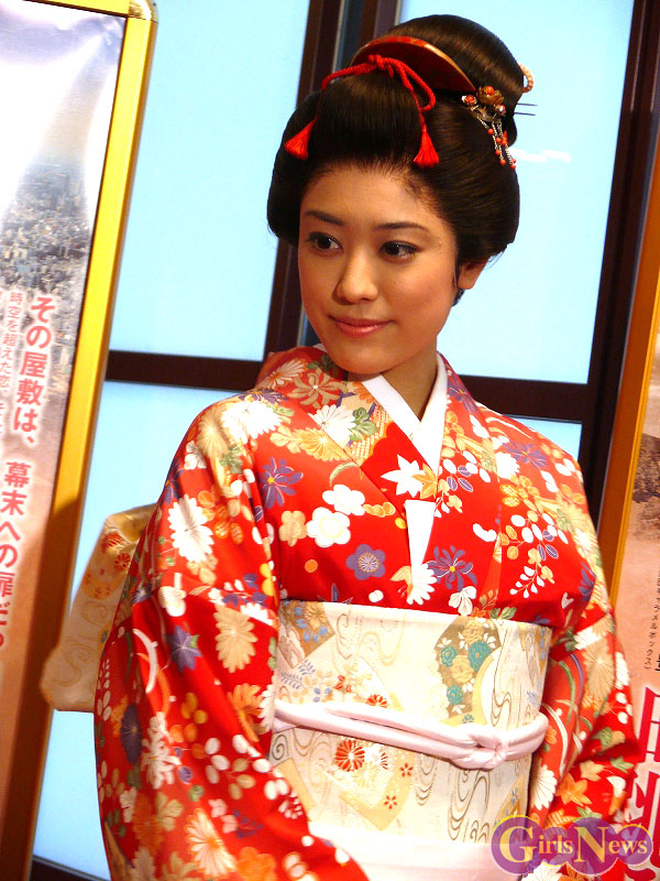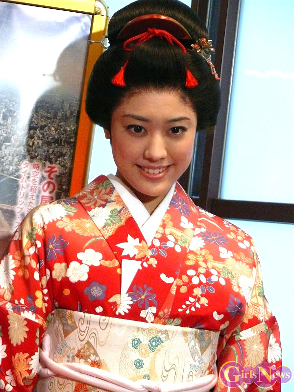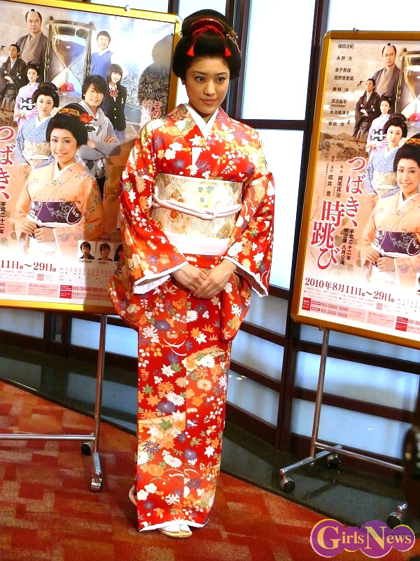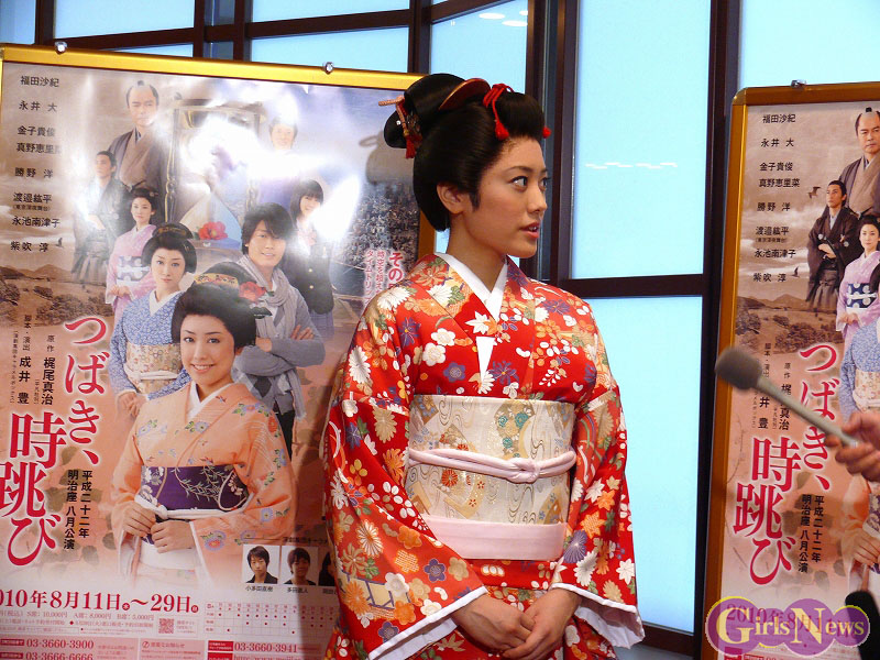 8月10日(水)東京都、日本橋の明治座にて、福田沙紀さんが座長を務める舞台「つばき、時跳び」の公演を前に、衣装で会見を行なった。