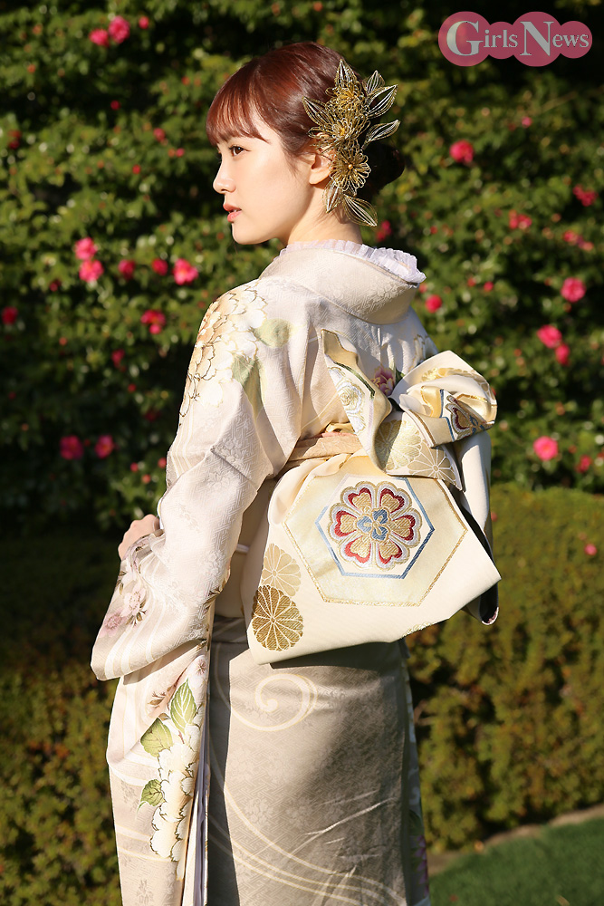 「前年までは色がしっかりとついたお着物だったんですけど、今回はクリーム色という肌馴染みする色で、散りばめられたお花も豪華。デザインも現代風で、可愛らしいなと思います。特に重ね襟がフリルになったものを着たことがなかったので、今回着れてとても嬉しいです。今のトレンドなのかもしれないですね」