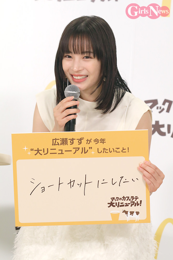 司会から商品の大リニューアルにちなんで、広瀬さん自身の“今年 大リニューアルしたいこと”を聞かれると、ボードに『ショートカットにしたい』と記した。「10代の頃はボブやショートが多かったので、この数年は長いのに憧れて伸ばしていたんですけど、年齢を重ねてきてからのショートのほうがカッコいい気がしてきました。今年こそ短くできたらいいな」と、目標を掲げていた。