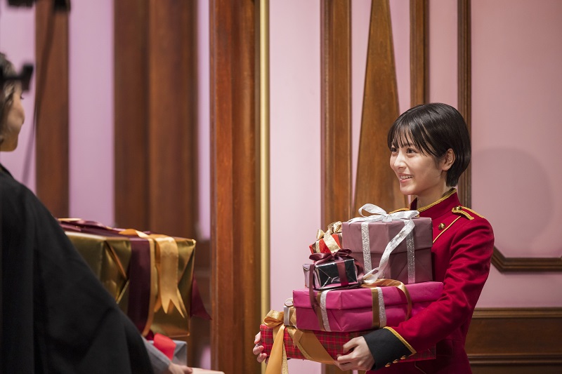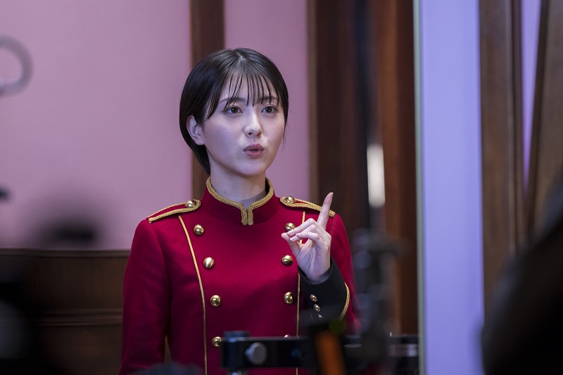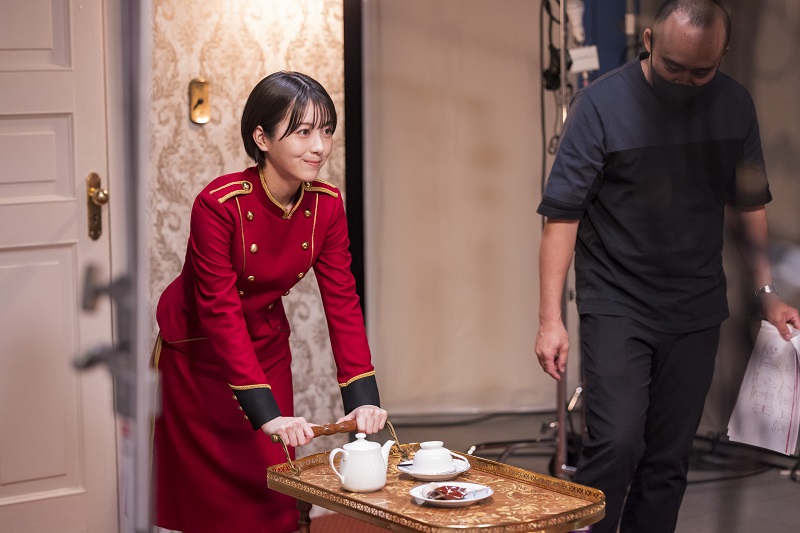 また今回もう一つのポイントは、ホテリエとしての仕草。撮影には専門のマナー講師も帯同し、映像を通して浜辺さんの仕草をチェックしていた。そんな仕草のポイントを聞いてみたところ、「足はつま先を少し空ける程度に開き、手は指先をピンと伸ばして添えるところです。浜辺さんは飲み込みが早いですね」と浜辺さんの適応力に驚いていましたという。