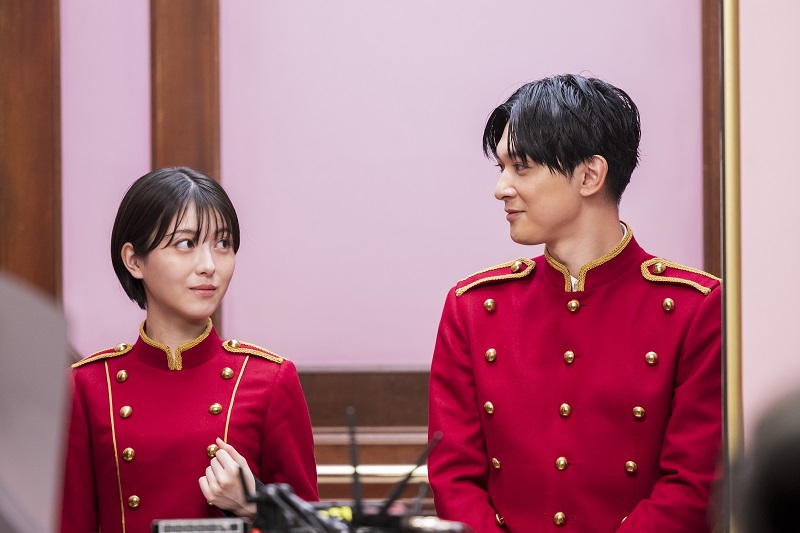 撮影日、「おはようございます!」と笑顔で登場したのは、赤地に金ボタンのついた制服、下は同じ赤地の膝丈スカートに黒のヒールの姿の浜辺さん。あご横あたりまでのスッキリとしたベリーショートヘアの髪型で、まさにホテリエといった清潔感のある装い。