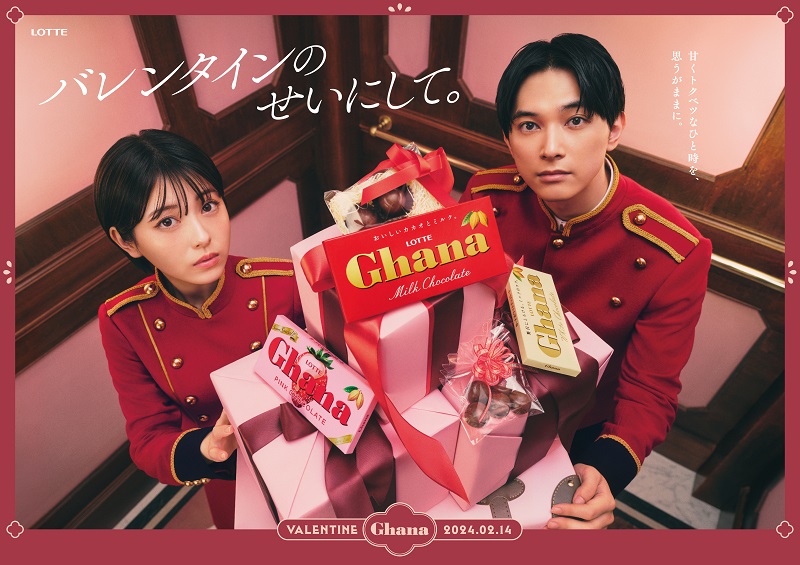シリーズ3年目となる今年のテーマは「Ghana Valentine Hotel」。ガーナがバレンタインの時期だけにオープンする架空のホテルを舞台に、バレンタインのせいにして、色々な過ごし方をしたい客たちが訪れ、優秀なホテリエの浜辺美波さんと吉沢亮さんがガーナと一緒に望みを叶えていくというストーリーとなっている。