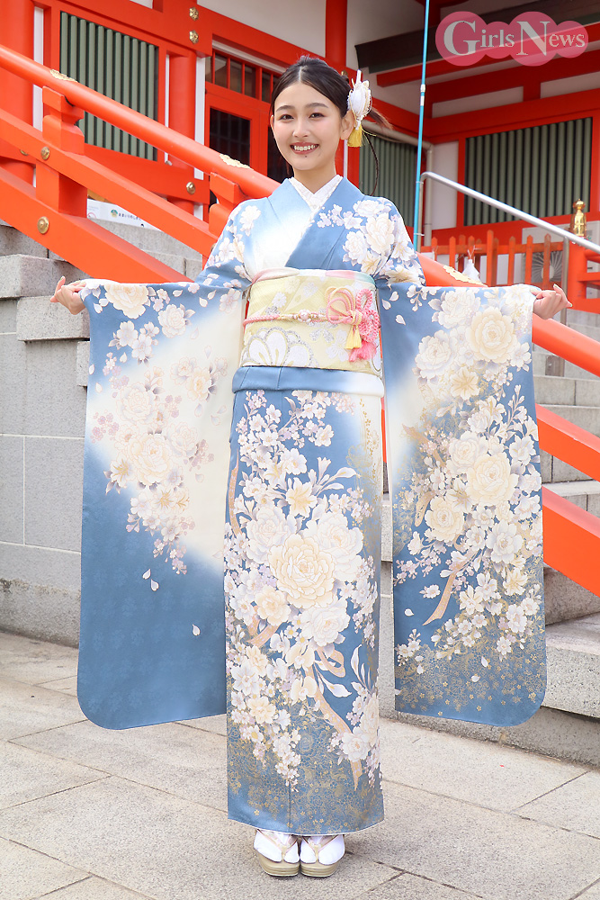「とても気に入っています。ちょっと大人っぽい上品なカラーでありつつ、あどけなさも残っていて、私らしい素敵な振袖だと思います。ピンクも水色も大好きなので、好きな柄の詰め合わせですね。すごい可愛らしくて脱ぎたくないです。このまま着て帰えりたいくらいですね」