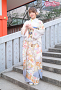 「ベージュトーンのベースに、いろんな色が入ってて、淡いパステル調の色合いがすごく綺麗なお着物です。帯がかっこよくて、そのギャップがポイントになっています。この着物のように上品で、綺麗で、たくさんの色合いを出せる女性になっていきたいです」