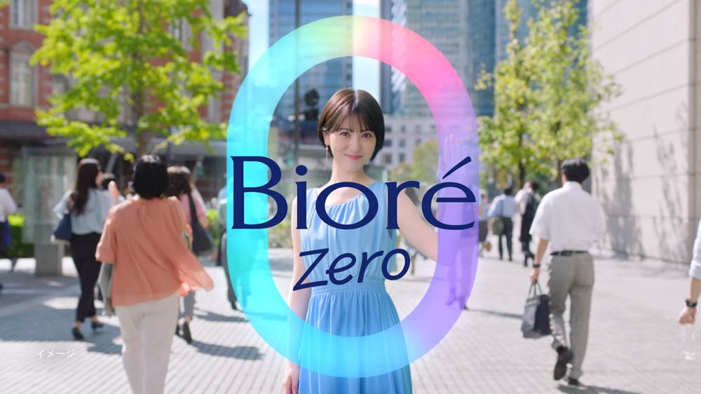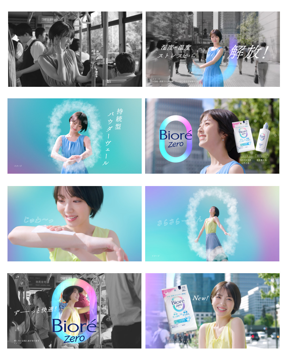 新テレビCM『誕生』篇は、ジメジメとした湿度、温度による汗のベタつきなど、誰もが日々悩まされている、不快な環境シーンからスタート。浜辺さんが、ぐるりと大きな「Zero」の円を描くと、そこは「湿度・温度ストレス」から解放され、快適に守られた別世界に早変わり。ふわりと「持続型パウダーヴェール」が肌を包んで快適が続き、自分らしくアクティブに過ごせる様子を描いている。浜辺さんの清々しい笑顔が印象的なCMになっている。