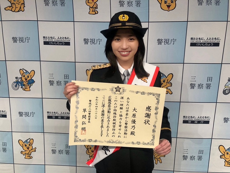 女優の大原優乃さんが23日、東京都・港区にある三田警察署の一日警察署長に就任。三田警察署特殊詐欺撲滅キャンペーンに登壇し、特殊詐欺撲滅を呼びかけた。