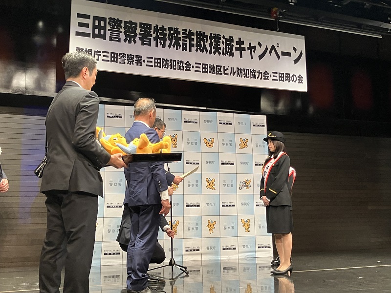 制服に身をつつんだ大原さんは、「私自身、一日警署長は初めてなので、光栄な気持ちで一杯です!」と、笑顔を見せた。三田警察署長から委嘱状が贈られたあと、特殊詐欺注意喚起トークショーに参加。