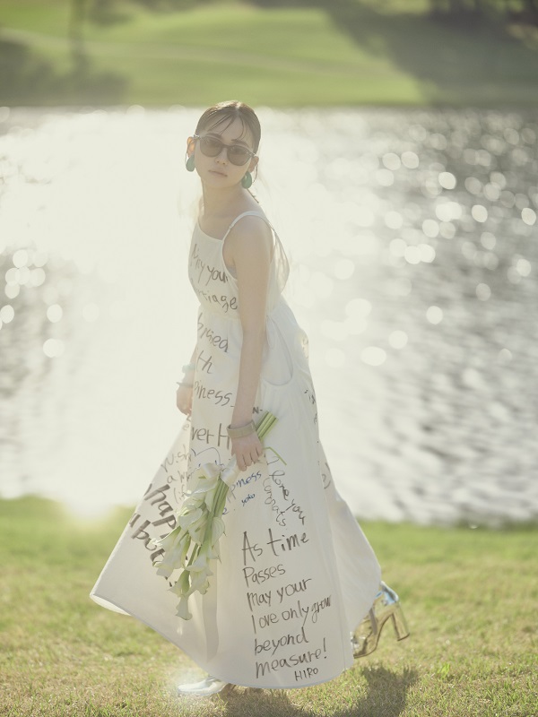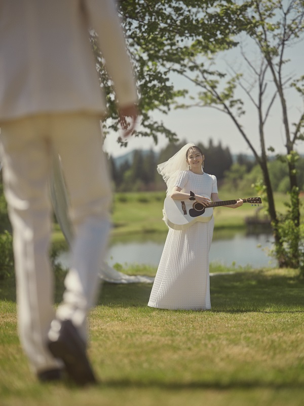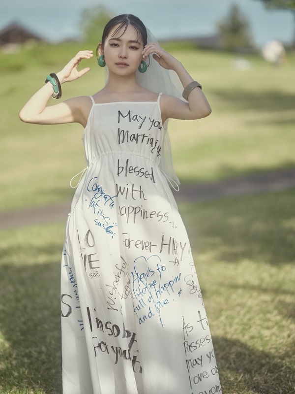 式の中で山田さんはウエディングドレスで五変化を披露。ゲストが直接メッセージを書き込んだ世界に1 着しかないドレスやボリューミーな袖とボディ部分が分かれているドレス、カジュアルなワンピースにベールを合わせたコーディネート、背景のグリーンに映えるラフな素材のドレス、とさまざまな表情を見せている。