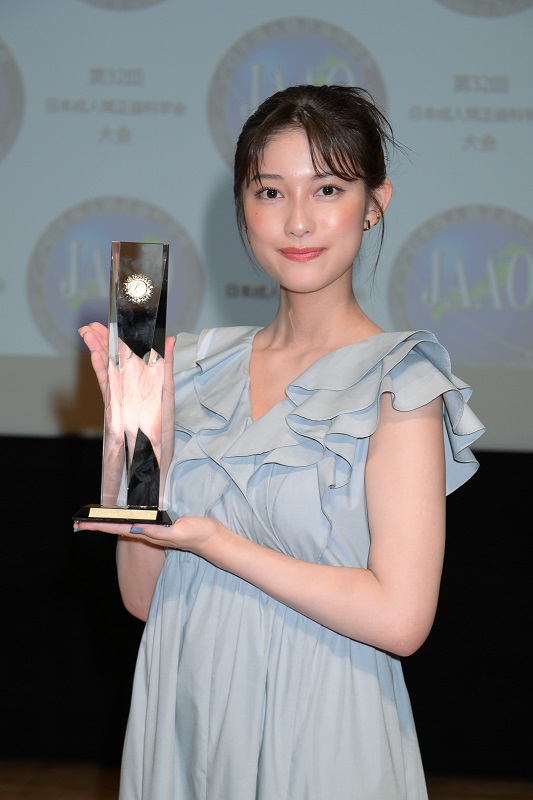 玉田さんは淡いブルーのワンピースで登場し、「素晴らしい賞をいただけて嬉しい気持ちでいっぱいです。過去の受賞者の方々も素敵な方ばかりで私が選んでいただいていいのかな︖という気持ちでしたが、この賞の名に恥じないよう一生懸命お仕事と自分磨きを頑張っていきたいです」と話した。