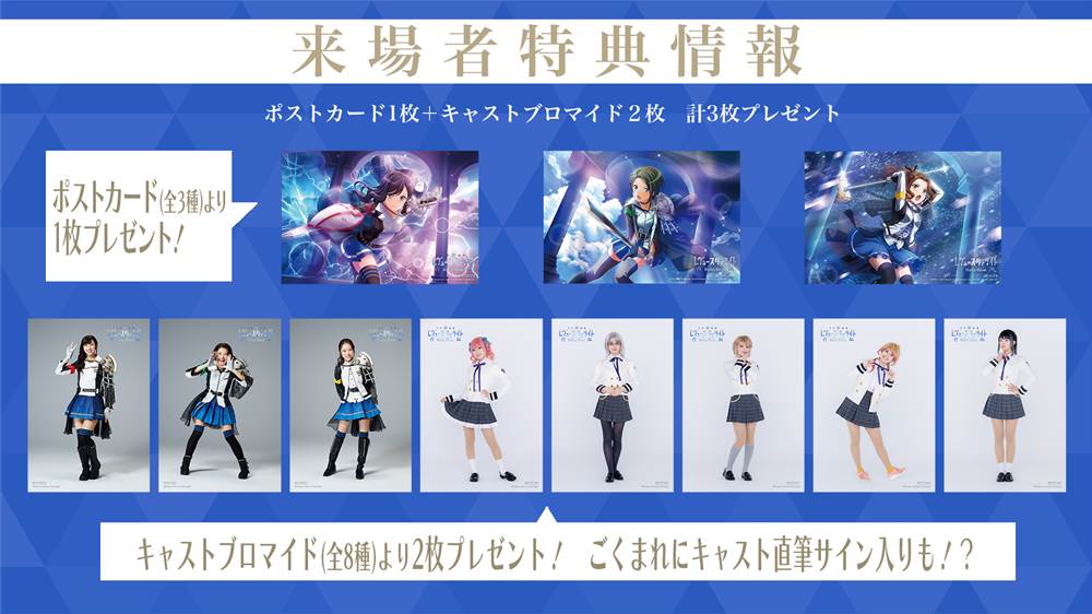 1部ミュージカルパートは歌と物語で紡ぐ本格的なミュージカル。2部はペンライトを振って盛り上がれるミニライブパート。さらに一部公演では、お見送り会とアフタートークを開催。来場者特典としてポストカードとキャストブロマイドもプレゼントされる。