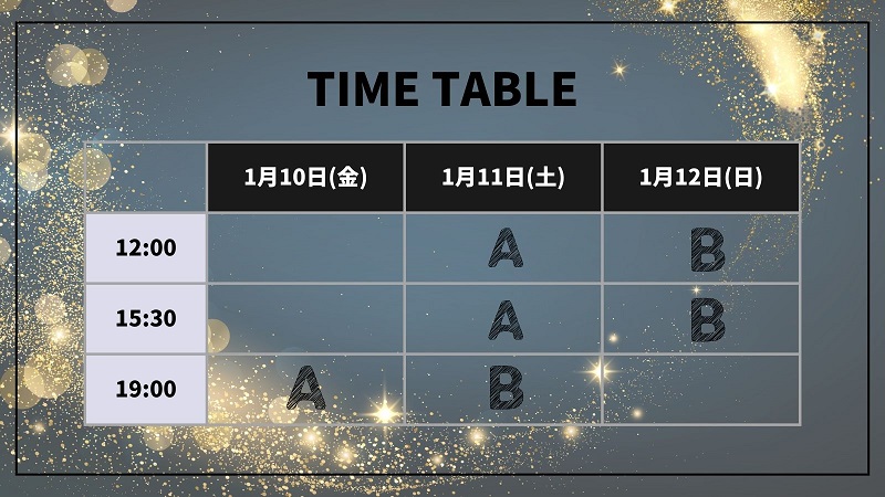 1月11日(土) 12:00(A)/15:30(A)/19:00(B)