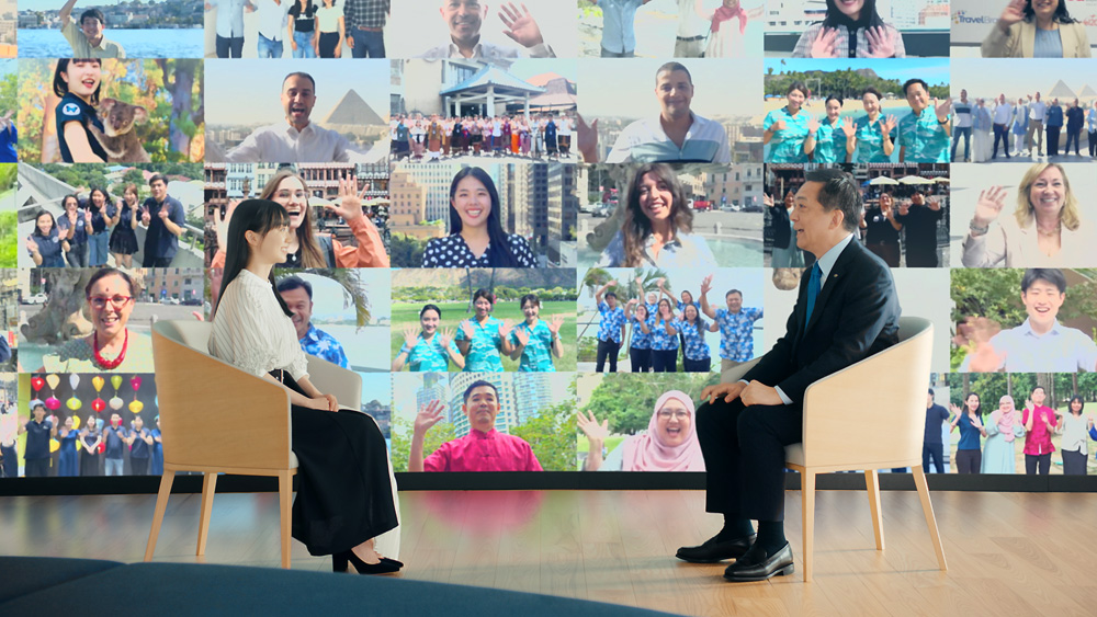 『世界各国の旅』篇の撮影では、芦田さんが大画面のモニターに映し出されたHISの世界各地のスタッフとつながっているシーンが印象的。彼女は、「本当に世界中のいろんな国々の方々が集まっているんだなと実感しましたし、皆さんすごく楽しそうにしていて本当にワクワクしました!」とコメントし、現地スタッフとのつながりを実感している様子だった。