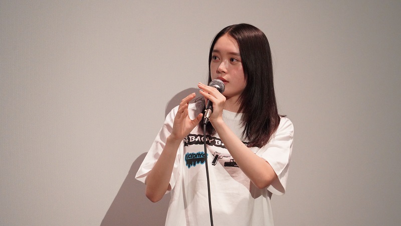 伊澤彩織さんがデザインしたTシャツに身を包み登壇した髙石さんは、「本日はこの3人でシネマ・ロサに帰ってくることができて本当に嬉しいです!」と挨拶。続けて、「シネマ・ロサに3人で登壇するのは、シリーズ1の2021年9月2日以来です」と、髙石さんとともにW主演を務めている伊澤彩織さんと阪元裕吾監督に伝えると、会場からは驚きと感嘆の声が上がった。