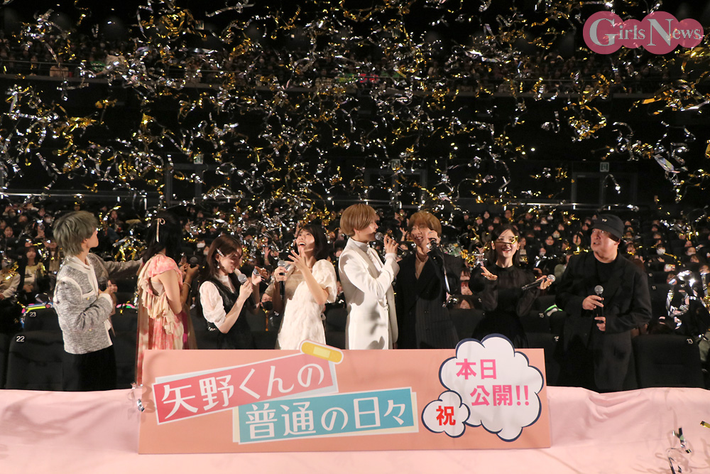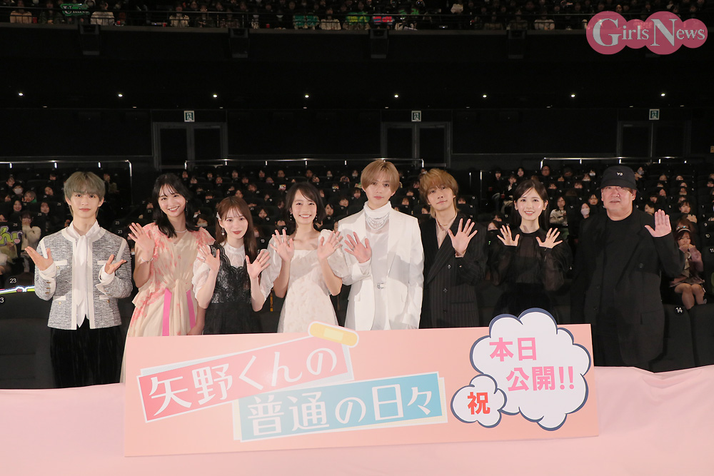 人気ラブコメ漫画を原作とする映画『矢野くんの普通の日々』が15日より全国公開。東京・丸の内ピカデリーにて開催された記念舞台挨拶に、主演の八木勇征(FANTASTICS)、ヒロイン役の池端杏慈、そして、中村海人(Travis Japan)、白宮みずほ、新沼凛空、伊藤圭吾(龍宮城)、筒井あやめ(乃木坂46)、新城毅彦監督が登壇した。