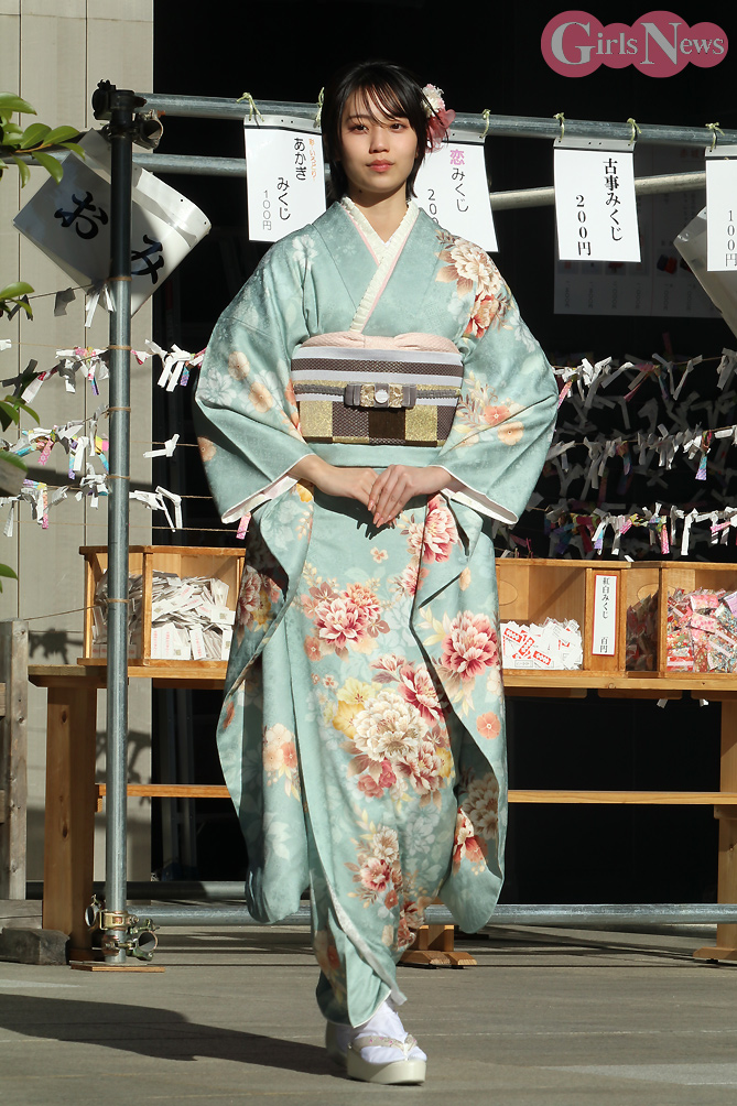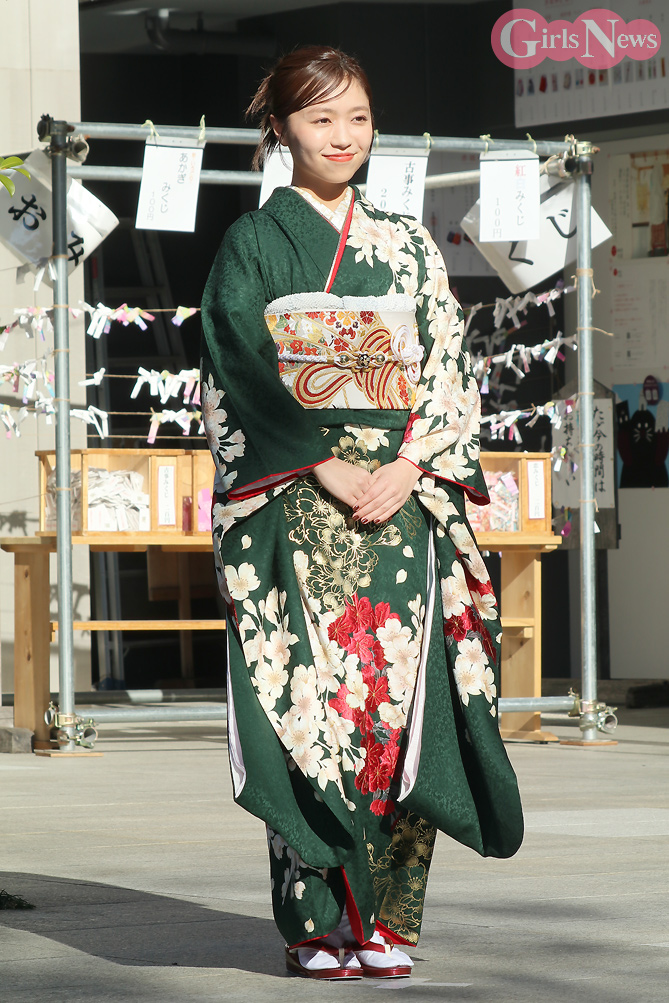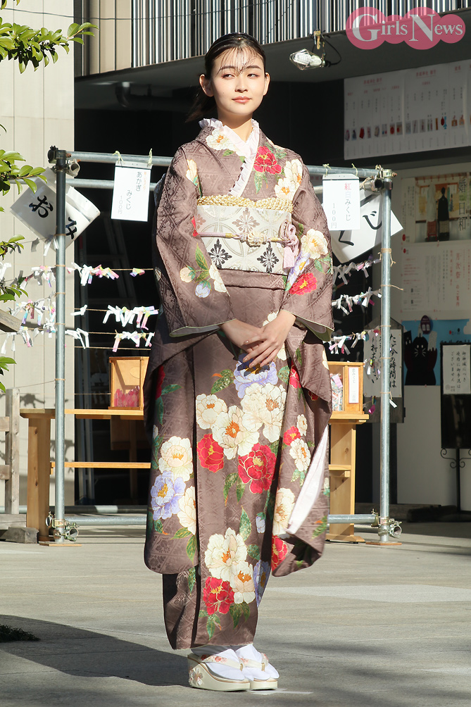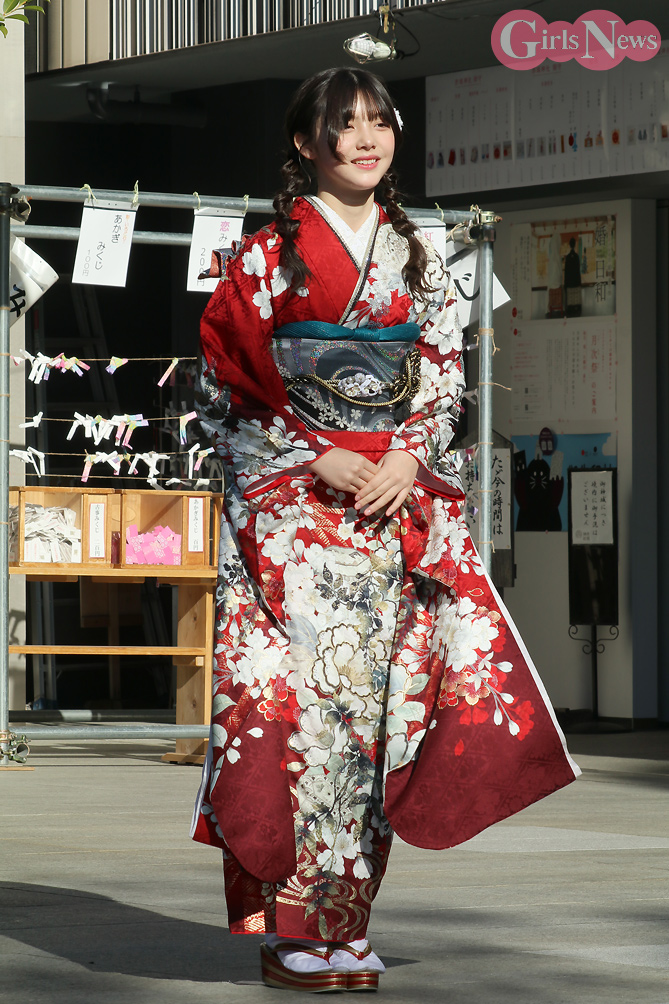 赤城神社は、新宿区にある歴史ある神社で、多くの参拝者に親しまれている。都会の喧騒から離れた静かな環境の中で、晴れ着姿のタレントたちがより一層輝きを放っていた。