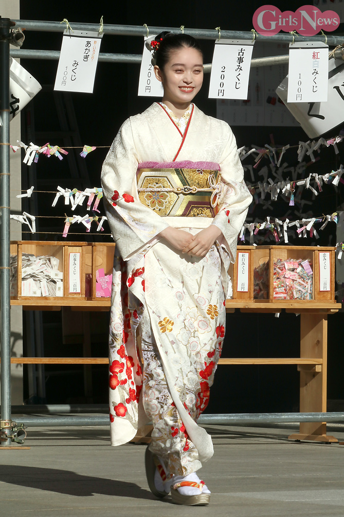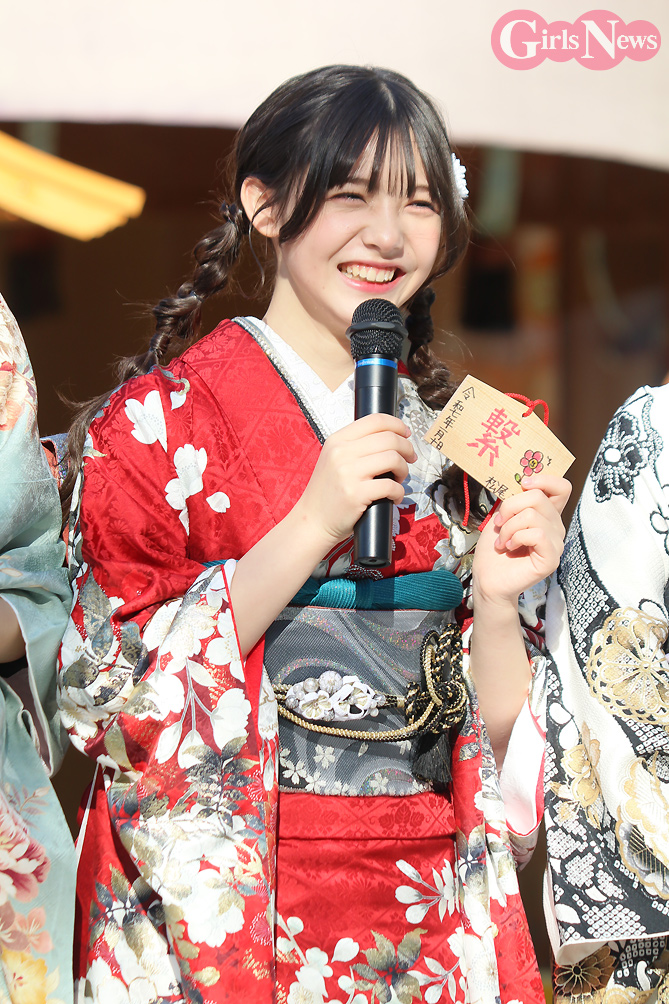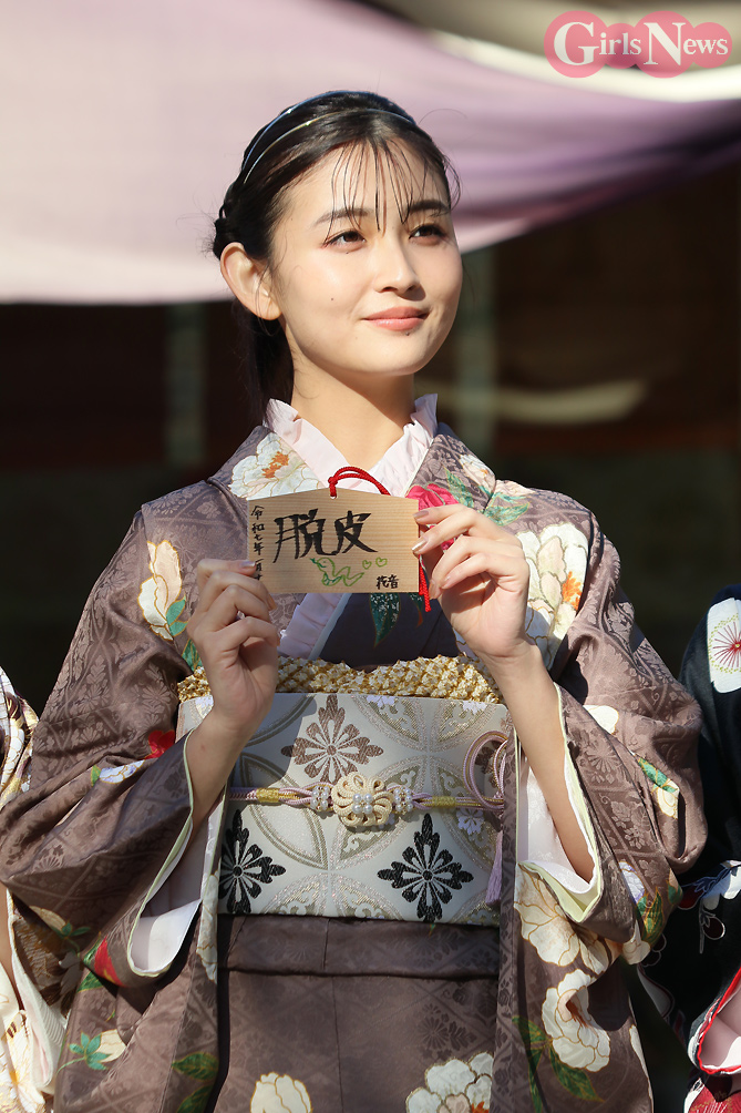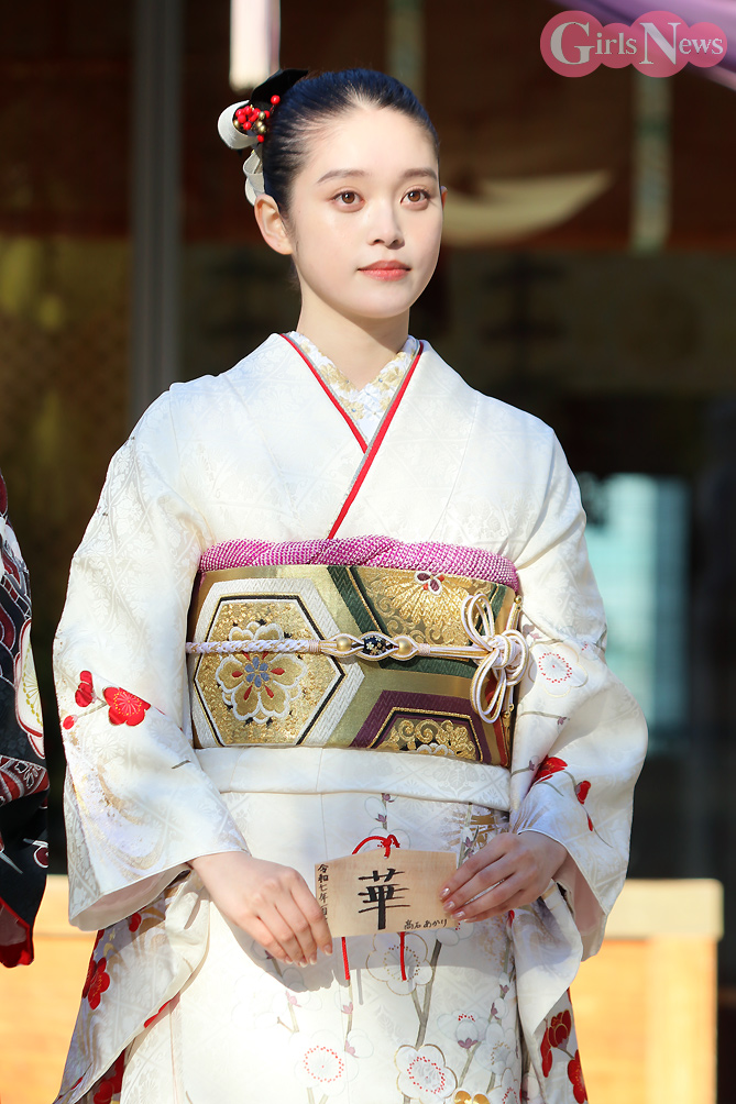 登壇したタレントたちは、鮮やかな晴れ着姿で境内に登場し、一人一人が新年の抱負を述べた。絵馬に『華と』記した髙石あかりは「自分は目の前にある役や作品に向かってしっかりと取り組むということが、大きな華を咲かせるアーティストだと思う。お芝居にまっすぐ向き合って頑張っていきたい」と語った。