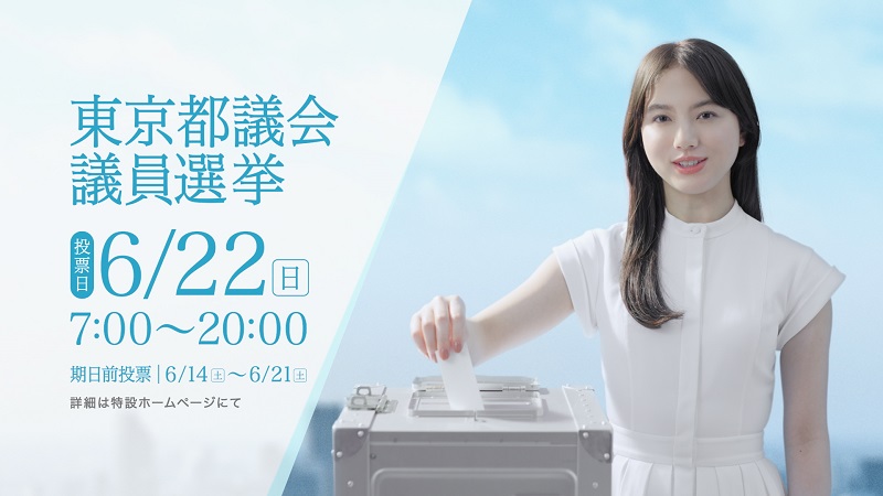 東京のみなさん、こんにちは。清原果耶です。6月22日は東京都議会議員選挙の日です。皆さんが見つめるその先にはどんな東京がありますか。思い描いた東京へ進んでいくために、それぞれの想いを込めて皆さんの選挙区の代表を選んでください。一人ひとりがこの街のキーパーソンです。一票一票、東京はすすむ。6月22日、東京都議会議員選挙。都合がつかない方はぜひ期日前投票をお願いいたします。詳しくはサイトなどをチェックしてください。