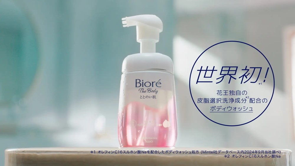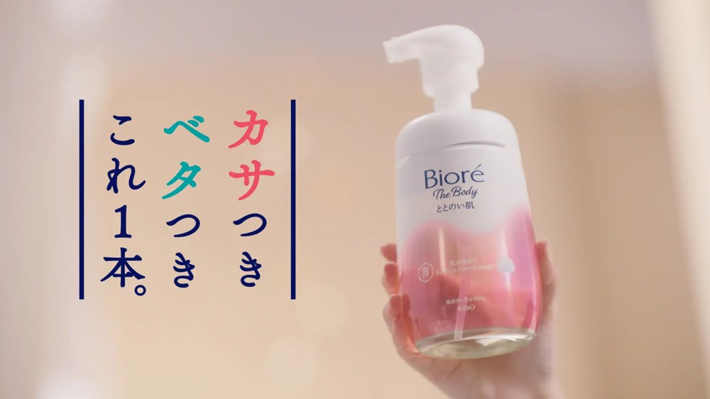 手で洗うだけでカサつきとベタつきを同時にととのえる『ビオレ ザ ボディ ととのい肌』。すすいだ後に現れる抱水ヴェールの物理的効果による「水ツヤのヴェール」が、カサつきを防ぎベタつきを抑えるという機能を解説する。CMでは、『ビオレ ザ ボディ ととのい肌』1本で肌がととのっていく様子が描かれている。