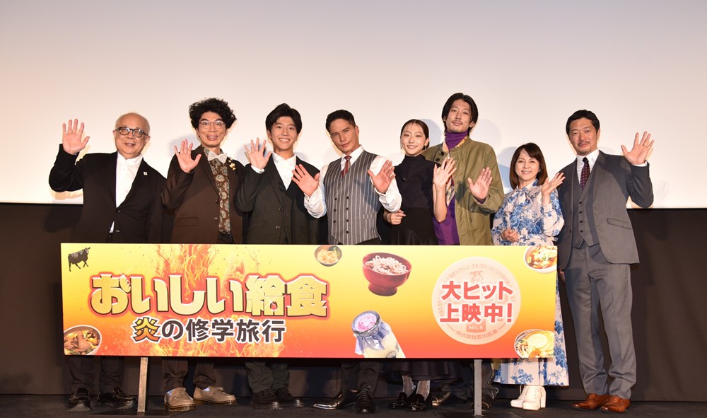 舞台挨拶には、田澤泰粋、栄信、片桐仁、小堺一機も登壇した。映画『おいしい給食 炎の修学旅行』は、新宿ピカデリー他全国公開中。