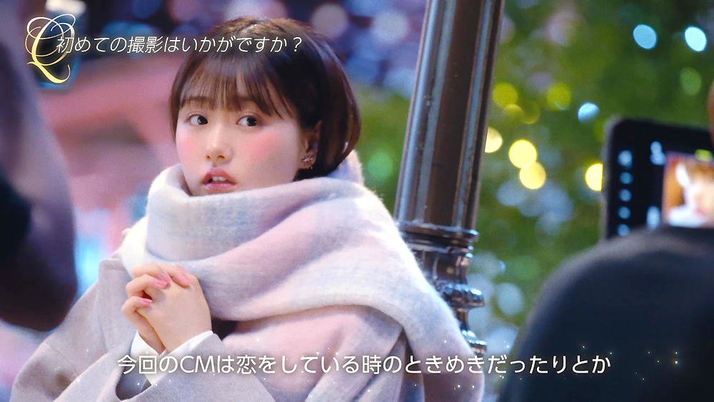 初撮影の感想について、原さんは「すっごく楽しいです!もう何日も前からずっと楽しみにしていて今日は気合いたっぷりで来ました! 今回のCMは恋をしている時のときめきだったりとかワクワク感をじゅわっとほてったほっぺで表現しています! 思わずキュンとしちゃうような恋する女の子のかわいさを感じてもらえる内容になっていると思います。イルミネーションを背景に、コートを着てマフラーをつけて冬らしい楽しい撮影でした♪」と紹介した。