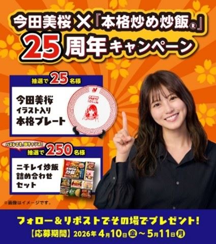 CMの放映開始に合わせて「今田美桜×『本格炒め炒飯®』25周年キャンペーン」も実施される。4月10日(金)から5月11日(月)までの期間、ニチレイフーズ公式X(旧Twitter)をフォローしキャンペーン投稿をリポストすると、今田美桜さんのイラスト入り本格プレートやニチレイ炒飯詰め合わせが当たる。