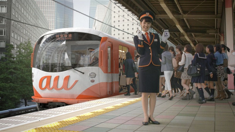 このCMではauのイメージキャラクターを務める女優の剛力彩芽さんが駅のホームでキュートな車掌姿で登場。まるで電車の乗り換えを案内するようにホームに並ぶ乗客におトクなスマホののりかえプラン「女子割」をお知らせする内容。