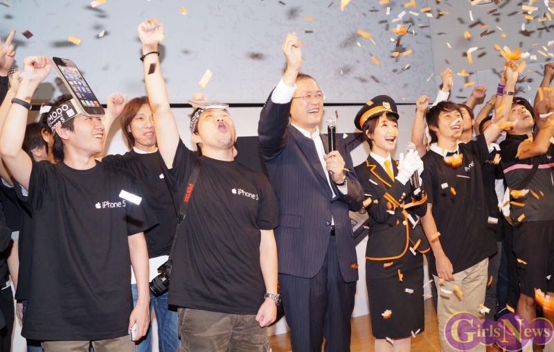 剛力彩芽さんは「au iPhone5出発します。」とアナウンスし、午前8時のiPhone5の発売を祝福した。