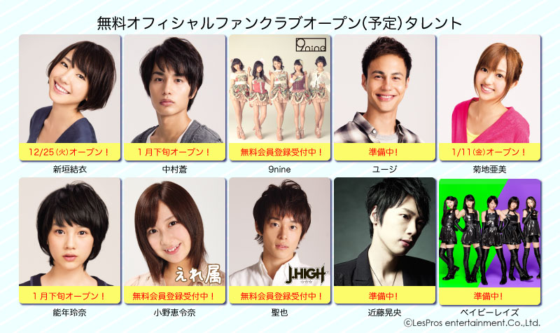 尚、レプロエンタテインメントに所属しているアイドリング!!!の菊地亜美さんも1月11日(金)にオフィシャルファンクラブがスタート。NHK連続テレビ小説「あまちゃん」のヒロインが決まっている女優の能年玲奈さんのファンクラブが1月下旬にスタート予定。