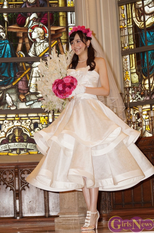 松井愛莉さんはウエディングドレスを着た感想として「あんまり無い形でリボンもついててとても可愛い。着るとわくわくします。」とコメント。