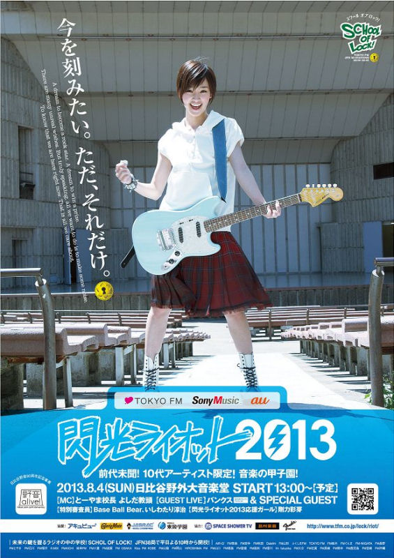 「閃光ライオット2013」は2013年8月4日(日)に日比谷野外大音楽堂にて開催。当日は剛力彩芽さんも駆けつけ10代の若きアーティストたちを直接応援する。