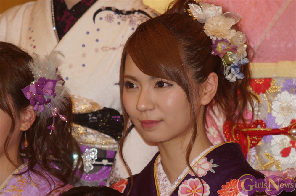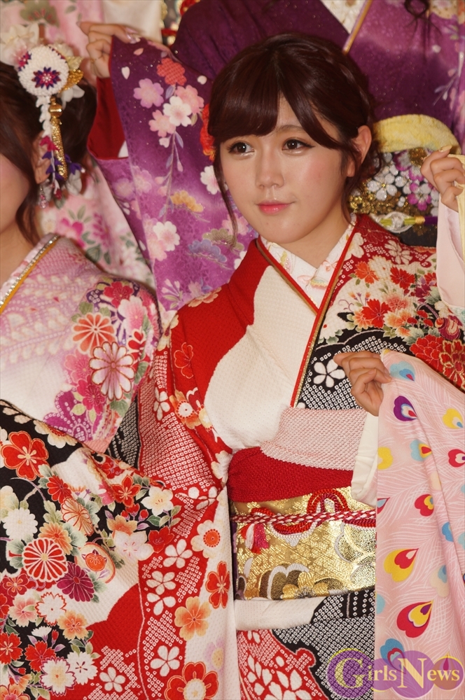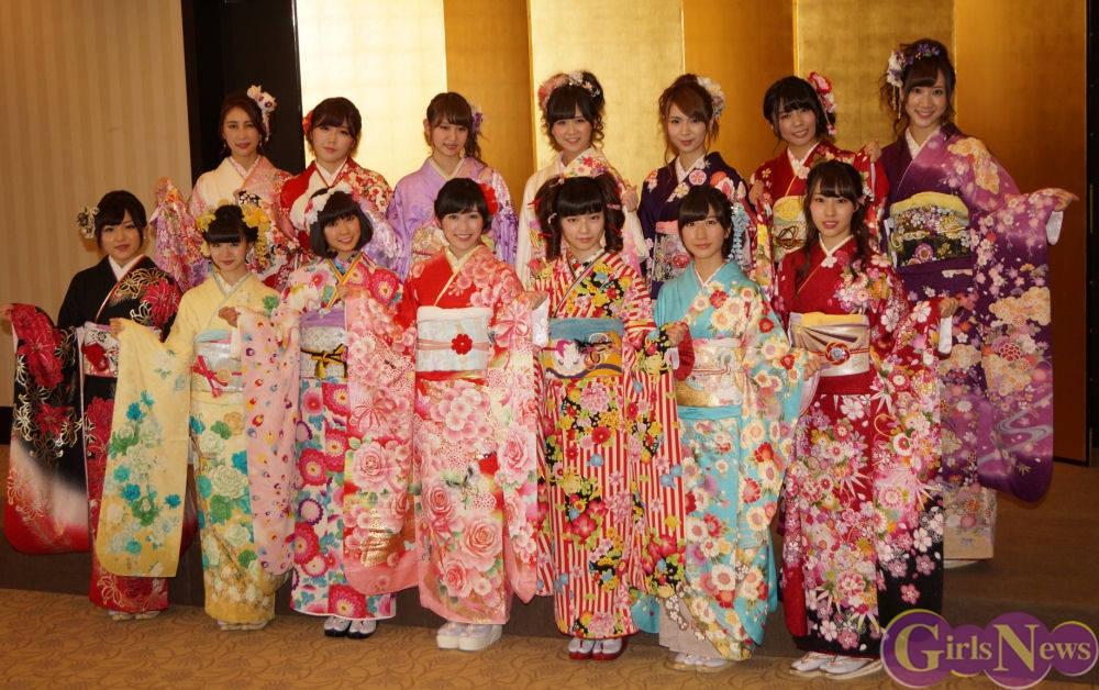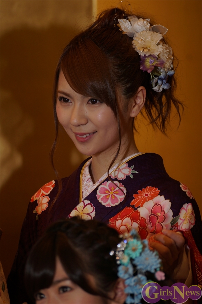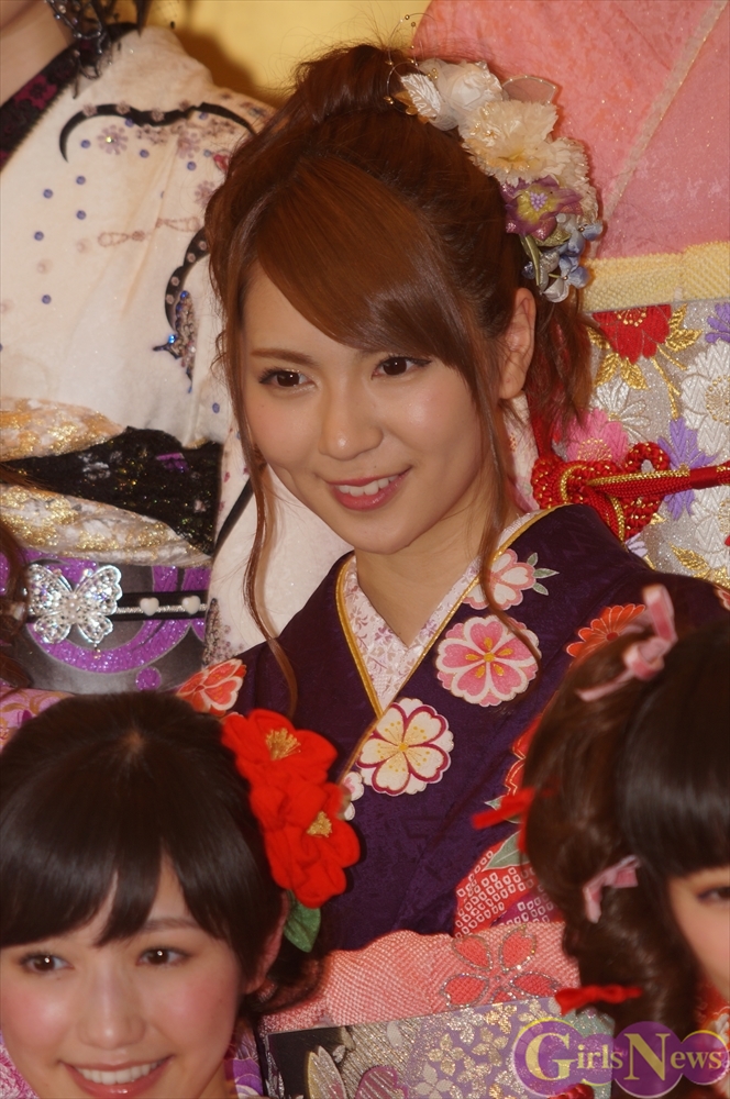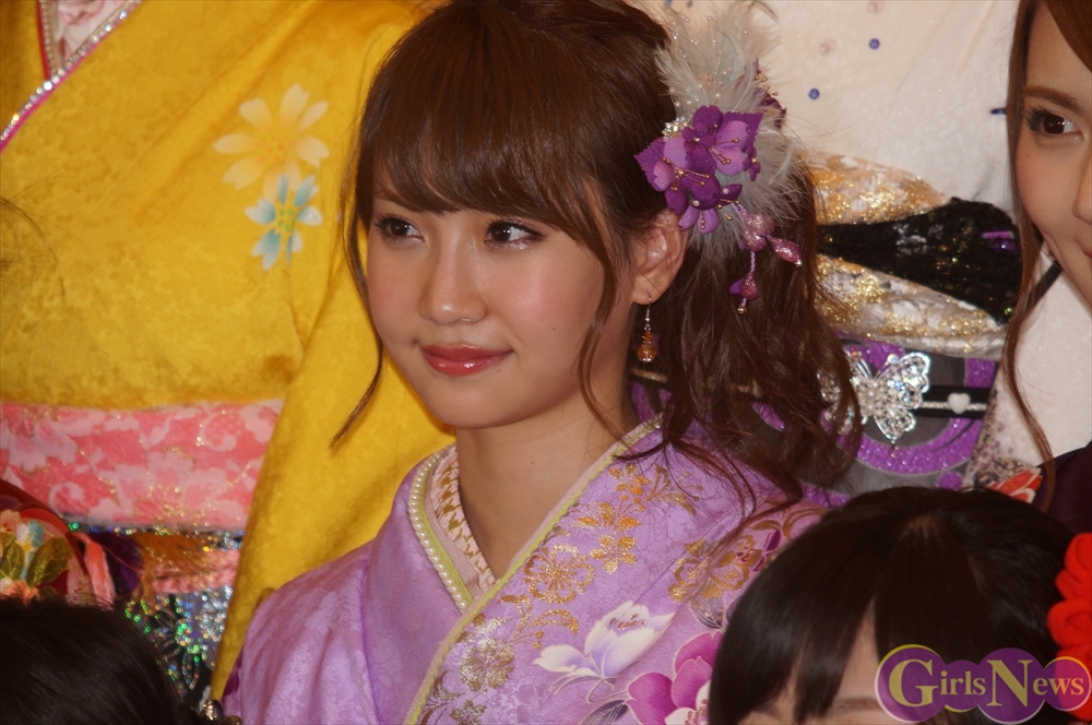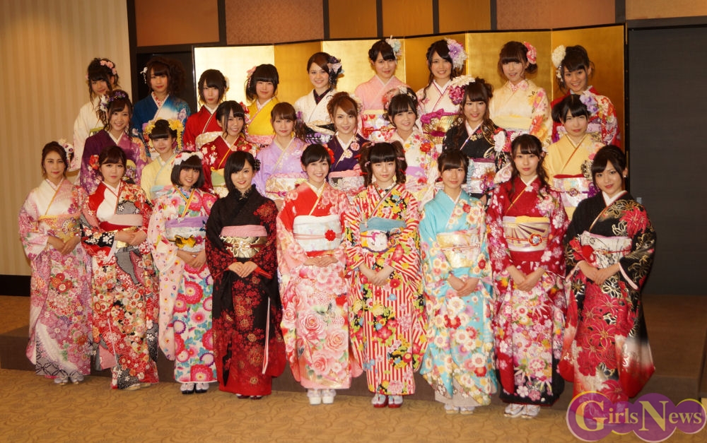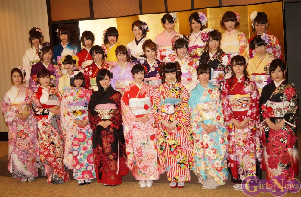 今年のAKB48グループ成人式は、AKB48から渡辺麻友さん・島崎遥香さんら13名、SKE48から木下有希子さんら7名、NMB48から山本彩さん・渡辺美優紀さんら6名の過去最多となる総勢26名で行われ、艶やかな着物姿を披露した。