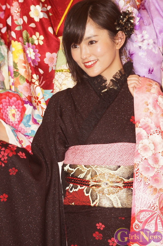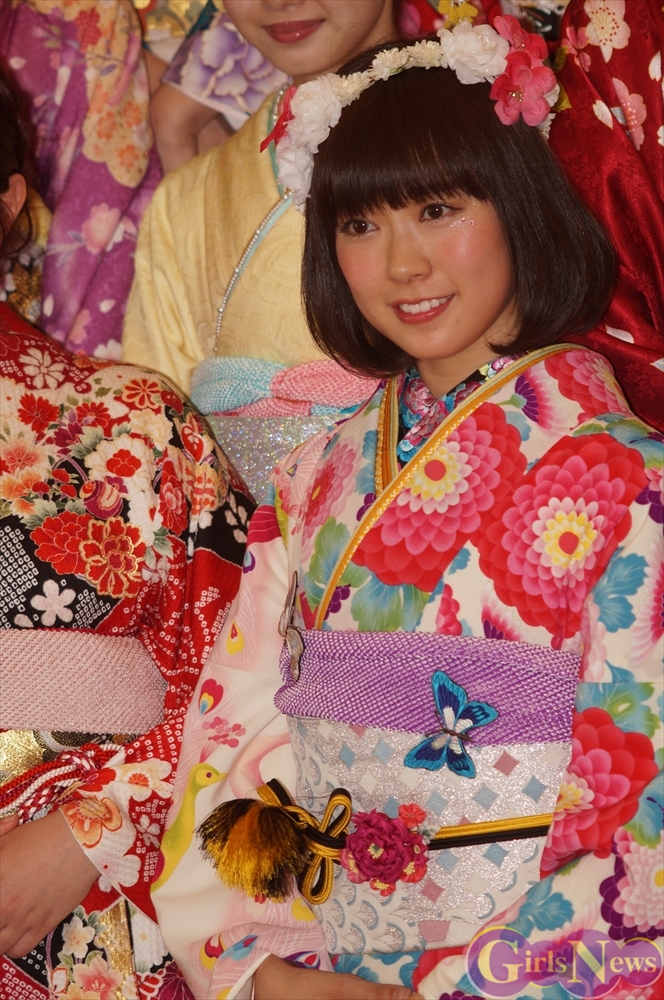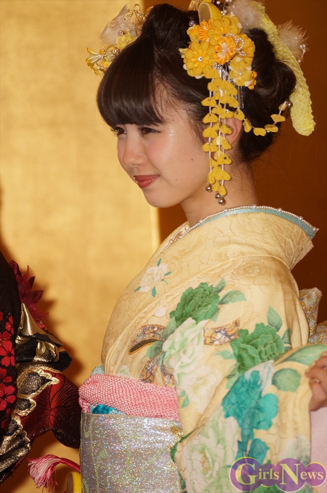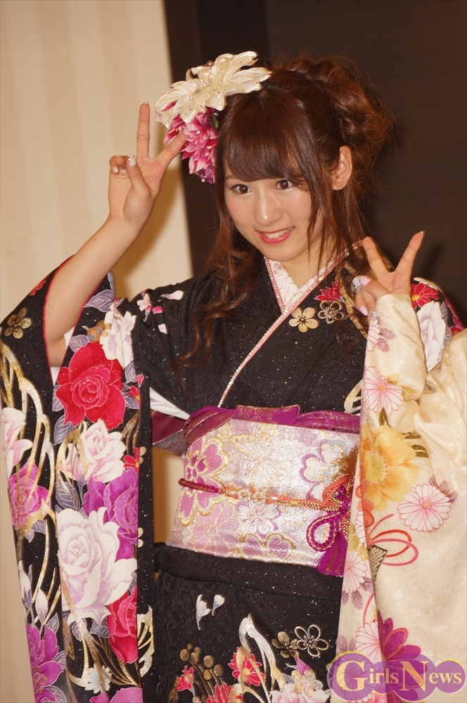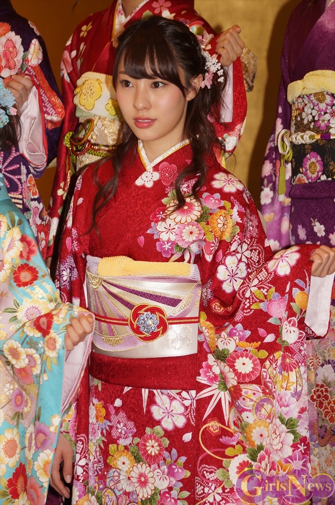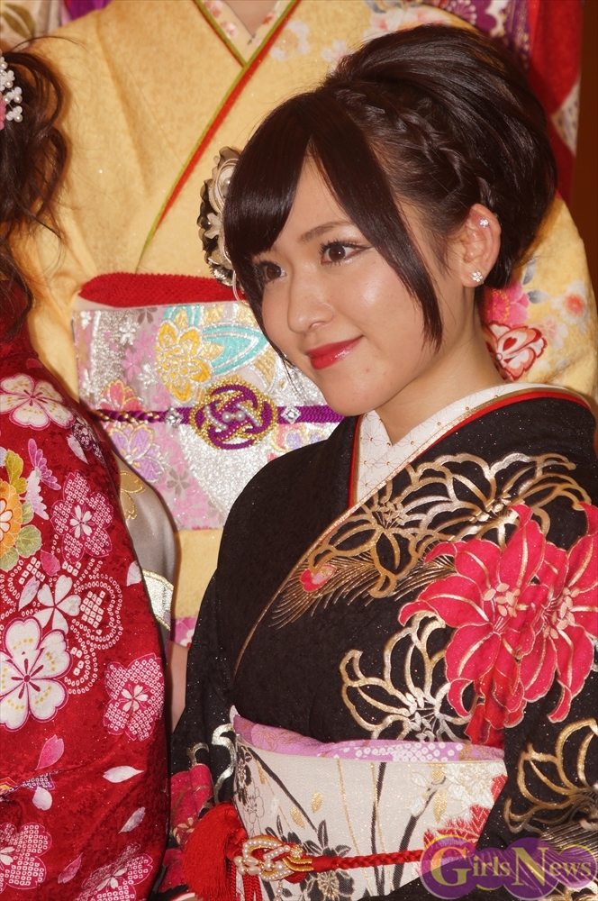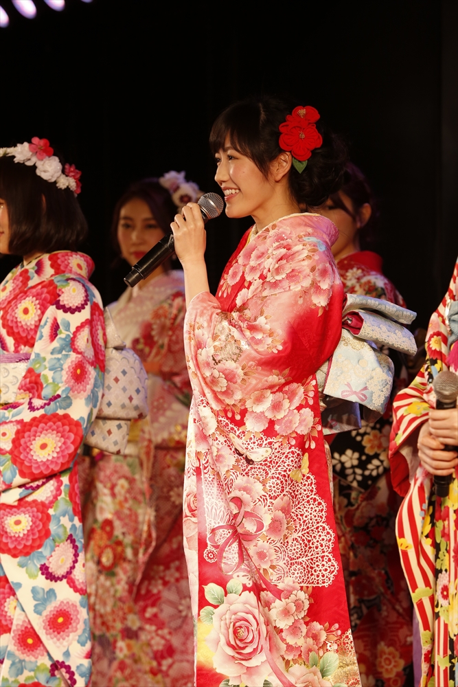 渡辺麻友さんは「私は今回自分でプロデュースをさせて頂きまして、自分の大好きなものを沢山デザインとして入れさせていただきました。ここに大きなバラが入っていたりとか、リボンとかレースの模様とかこっちの帯の方にもリボンの模様が入っていたり、自分の好きなモノを沢山入れて、人生に一度きりの成人式ということで、自分の大好きな着物を着れてとても嬉しく思っています。」