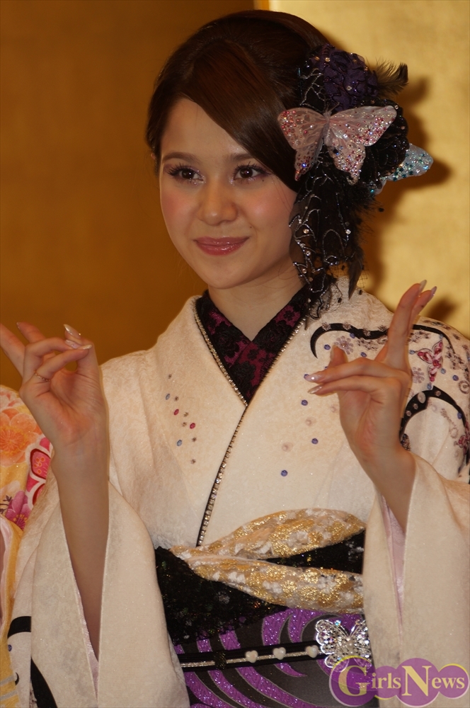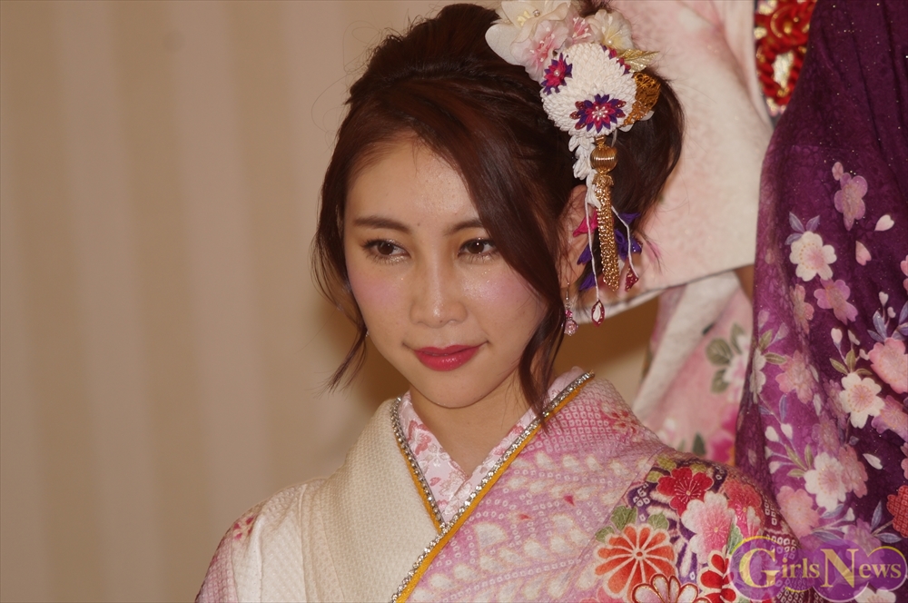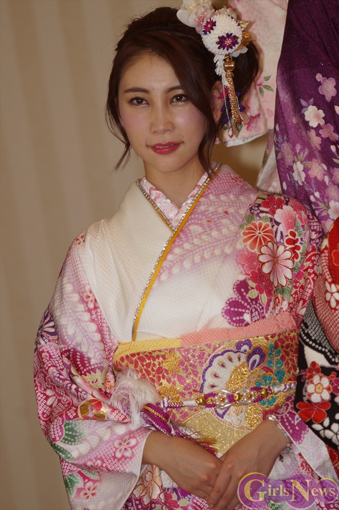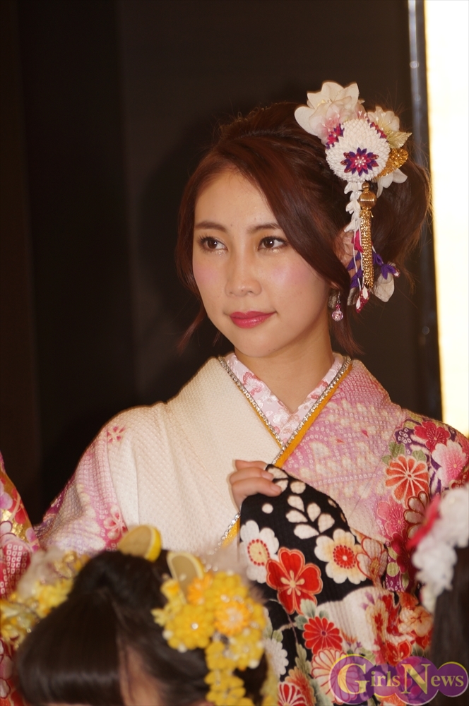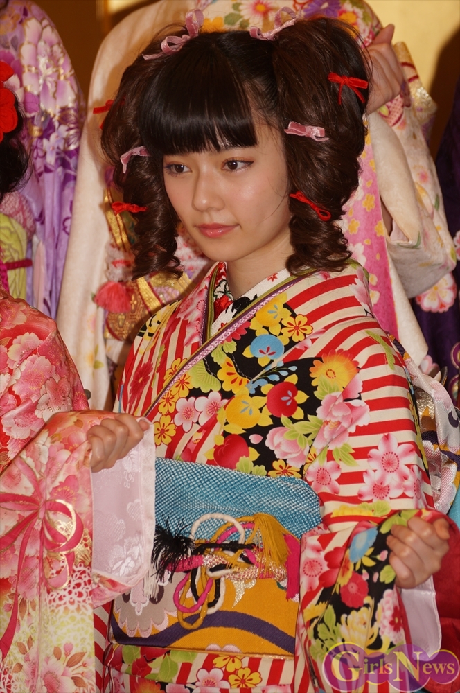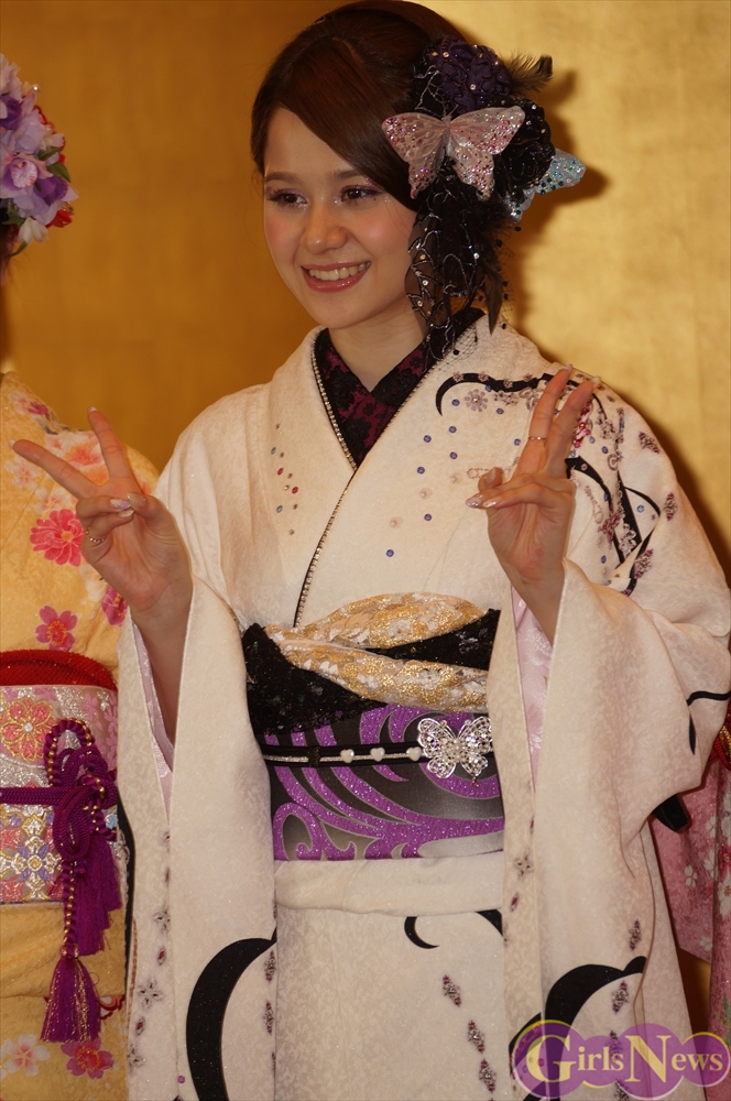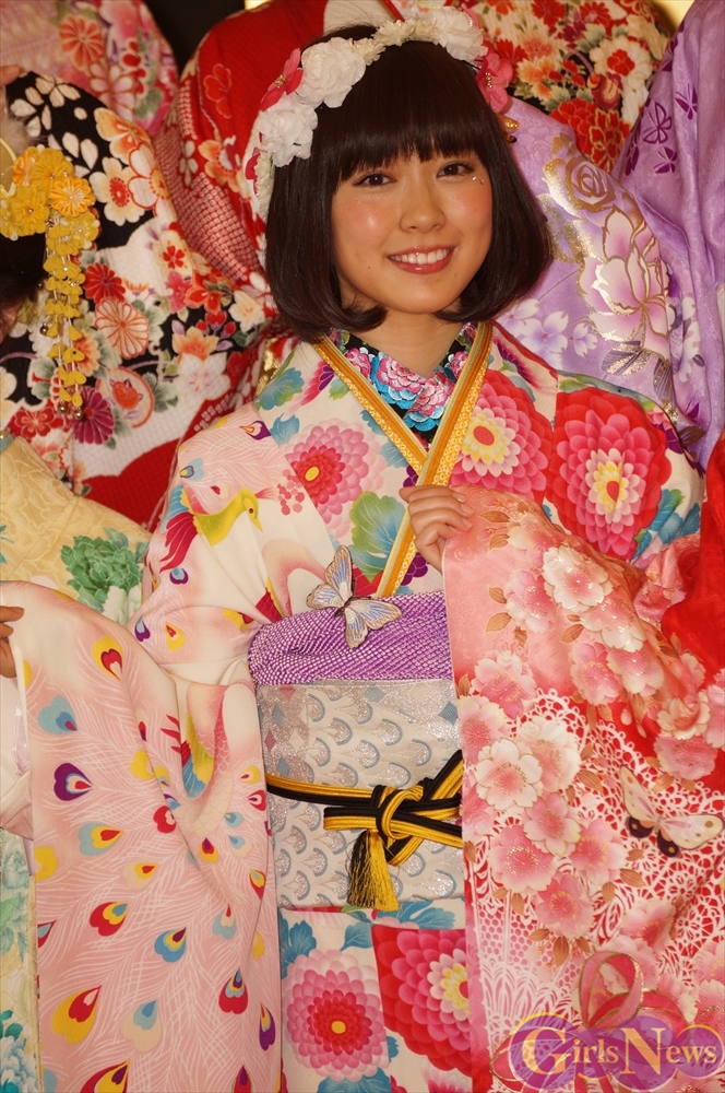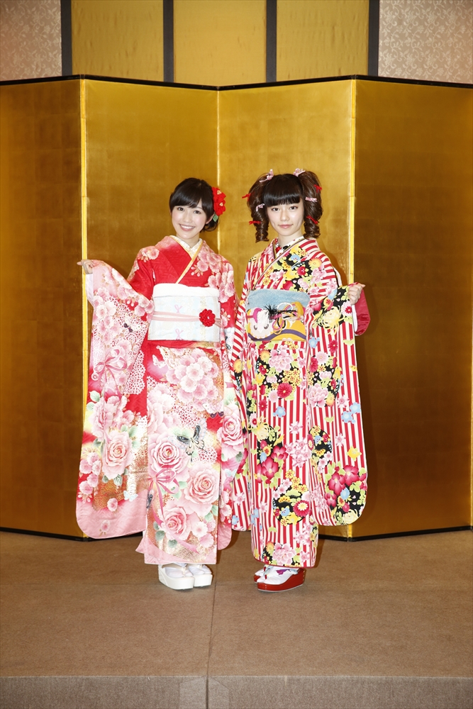 渡辺麻友さんは「私は今回自分でプロデュースをさせて頂きまして、自分の大好きなものを沢山デザインとして入れさせていただきました。ここに大きなバラが入っていたりとか、リボンとかレースの模様とかこっちの帯の方にもリボンの模様が入っていたり、自分の好きなモノを沢山入れて、人生に一度きりの成人式ということで、自分の大好きな着物を着れてとても嬉しく思っています。」