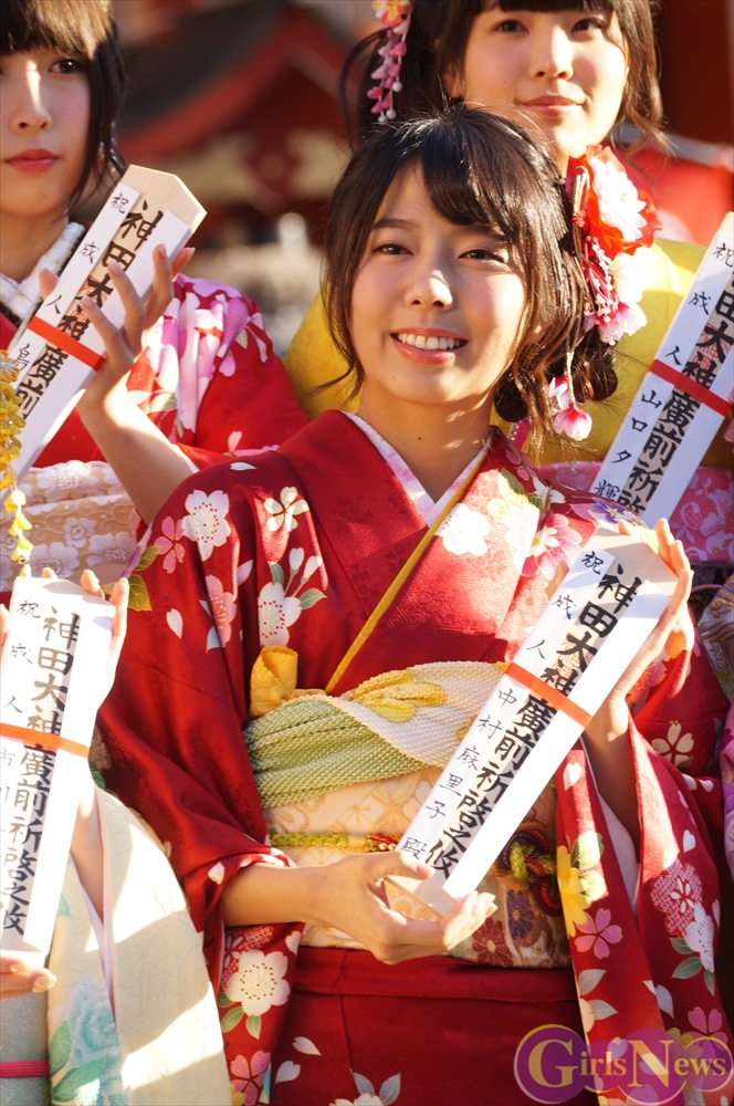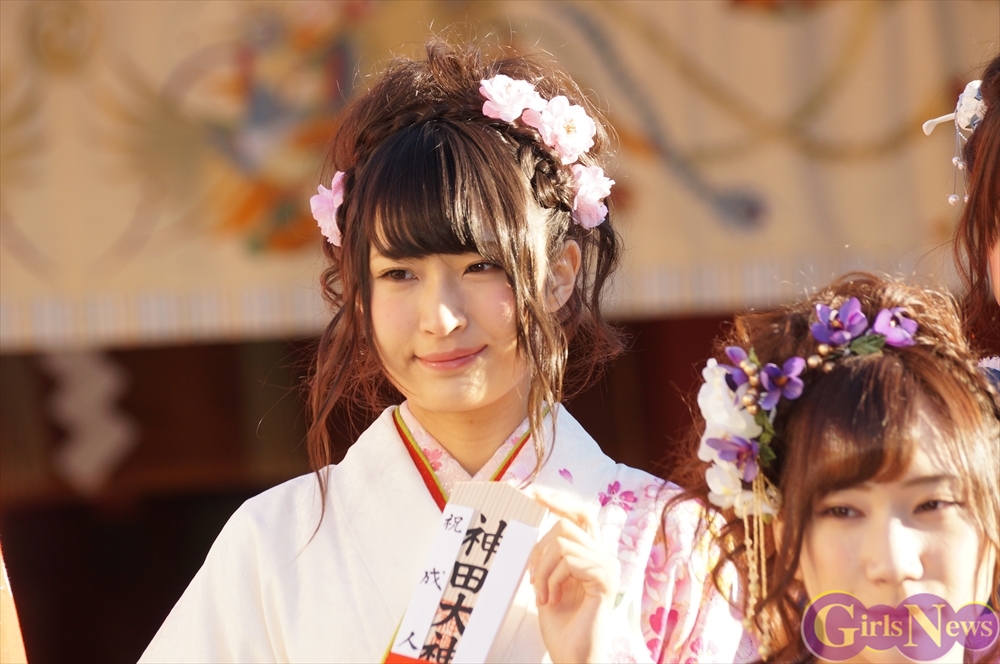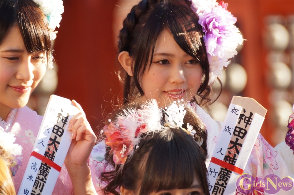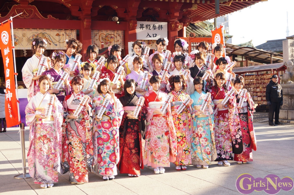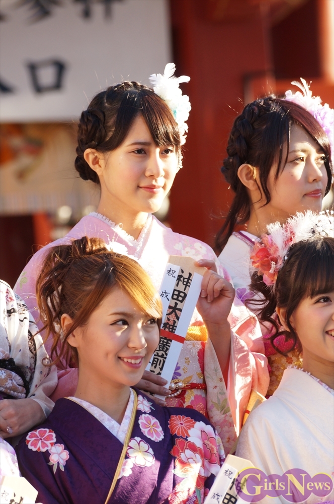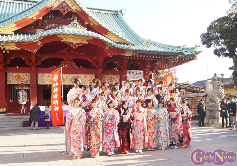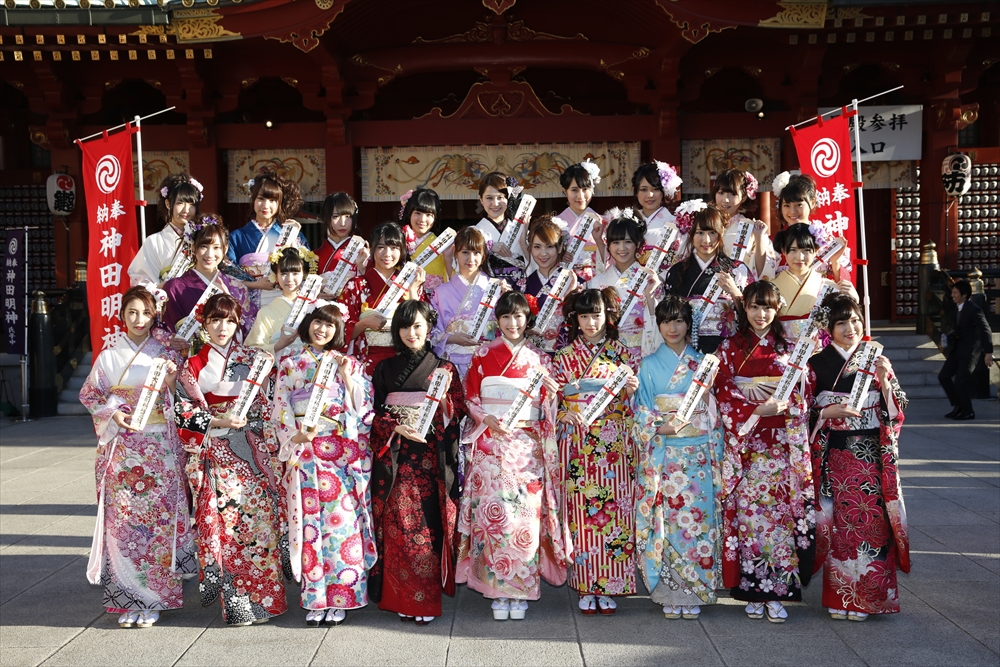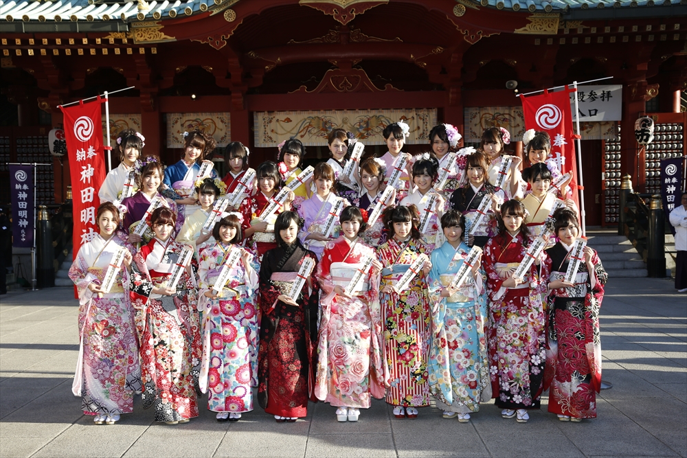 早朝、着物姿で神田明神に参拝に訪れたAKB48グループのメンバーは社殿内神殿にて神主様からご祈祷を受け、その後、社殿前で記念撮影。多数のファンに見守られる中、それぞれの個性溢れる晴れ着姿を披露した。