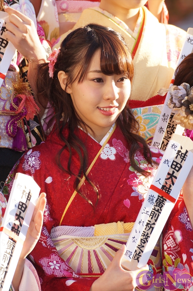 AKB48の藤江れいなさんは「最近は若手の子が凄くグイグイきてると思うんですが、今年大島優子ちゃんが卒業を発表したので、私たちの世代が引っ張っていかなきゃいけないなっていうふうにも思っています。あと、個人的に2年前にあっちゃんが赤の振り袖を着ていて、去年さっしーが赤の振り袖を着ていて、今年は何人かいるんですけど、私も赤を着させてもらえたので、そのことを覆せるように20歳素敵な歳にしたいなと思います。」