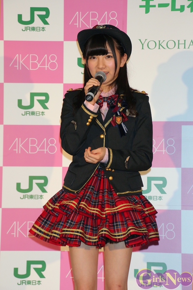 この日の会見には、JRの制服をベースにAKB48仕様にアレンジされた衣装で3人が登場した。