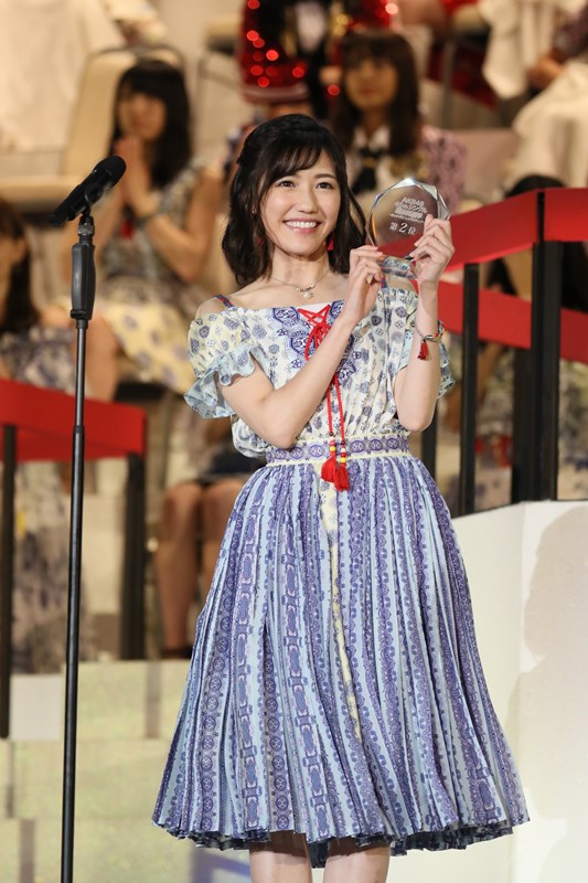 第2位は、渡辺麻友さん。速報で1位となり、昨年のリベンジに期待がかかったが、あと一歩及ばず、挨拶では「わー、惜しい!」と悔しさをにじませながらも、ともに戦ってくれたというファンに対し感謝の気持ちを伝えた。また、後輩たちに対しても「恵まれた環境への感謝の気持ちを忘れずにいてほしい」「今という一瞬を悔いのないように日々歩んでいってほしい」と語り掛けた。