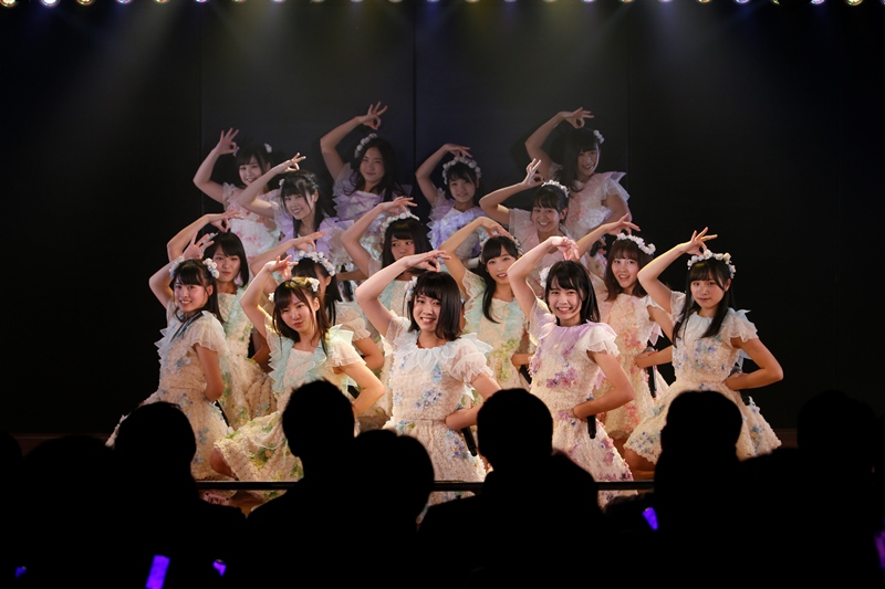 公演の幕開けは最新シングル『ハイテンション』。会場全体をアゲアゲな空気でつつむと、続いてのパフォーマンスは、先日オーディションを終えたばかりの16期研究生による『会いたかった』。一生懸命に初々しくパフォーマンスをする19名には、ファンも温かい声援やコールを投げかけていた。