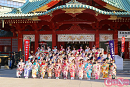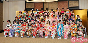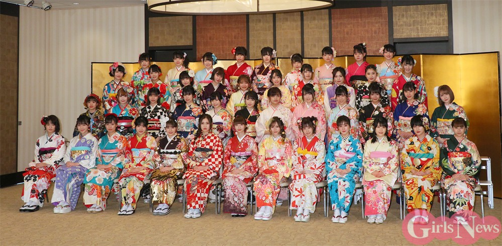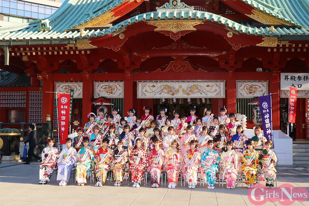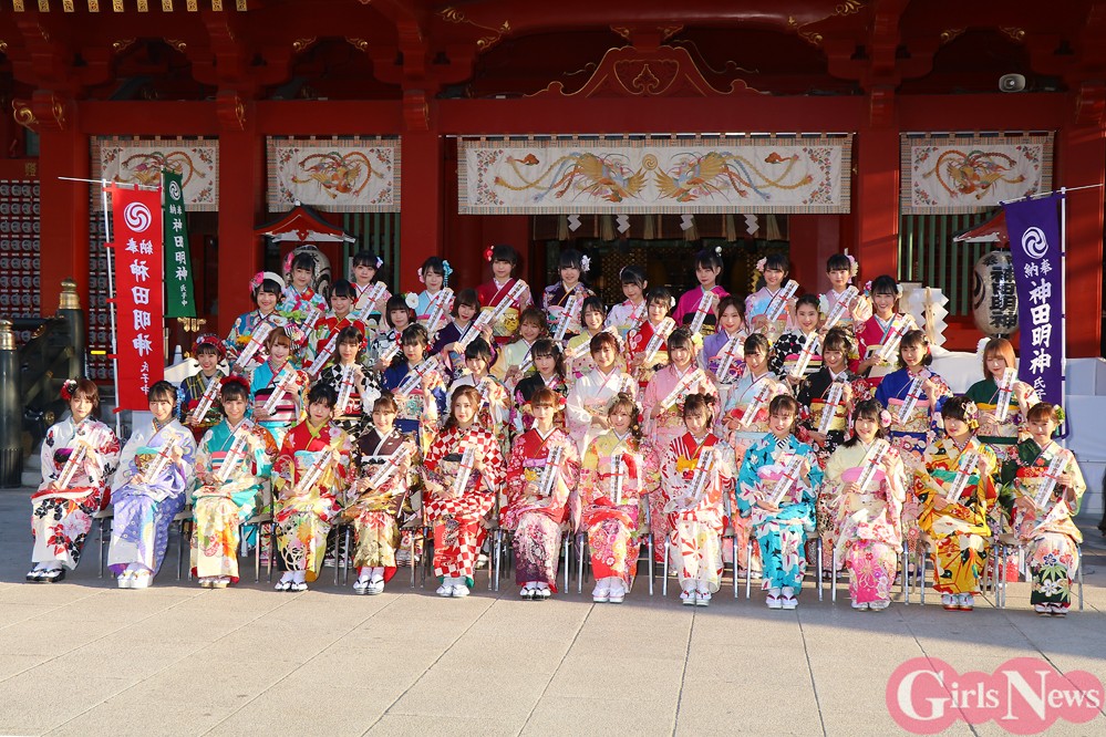 AKB48グループ合同の成人式が14日、千代田区・神田明神で行なわれた。今年は過去最多の国内外7グループの45人が新成人となり、体調不良で欠席したSTU48三島遥香さんを除く44名が成人の儀に臨んだ。