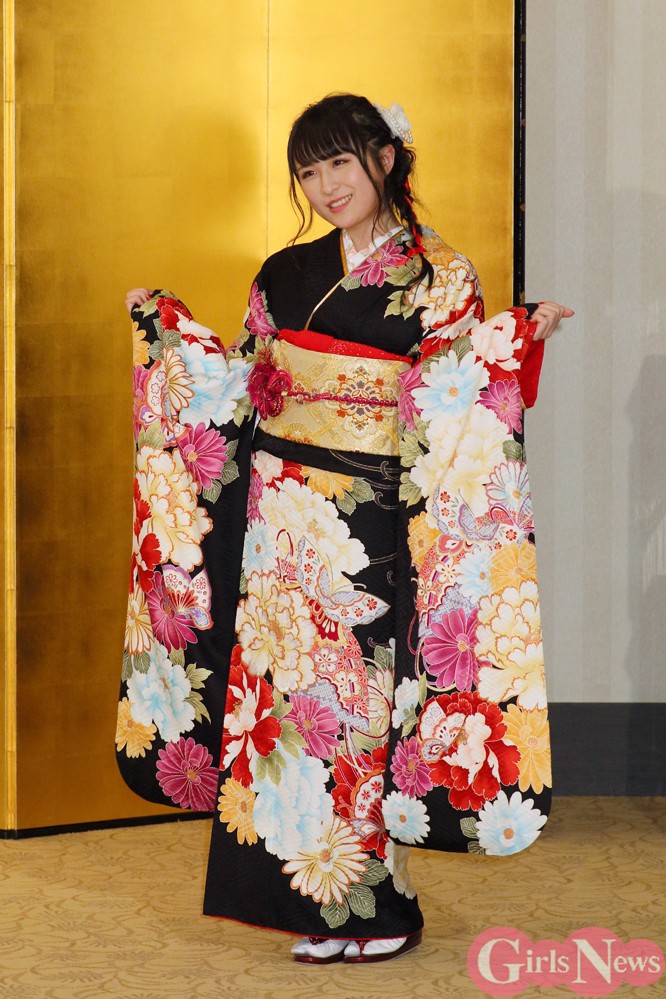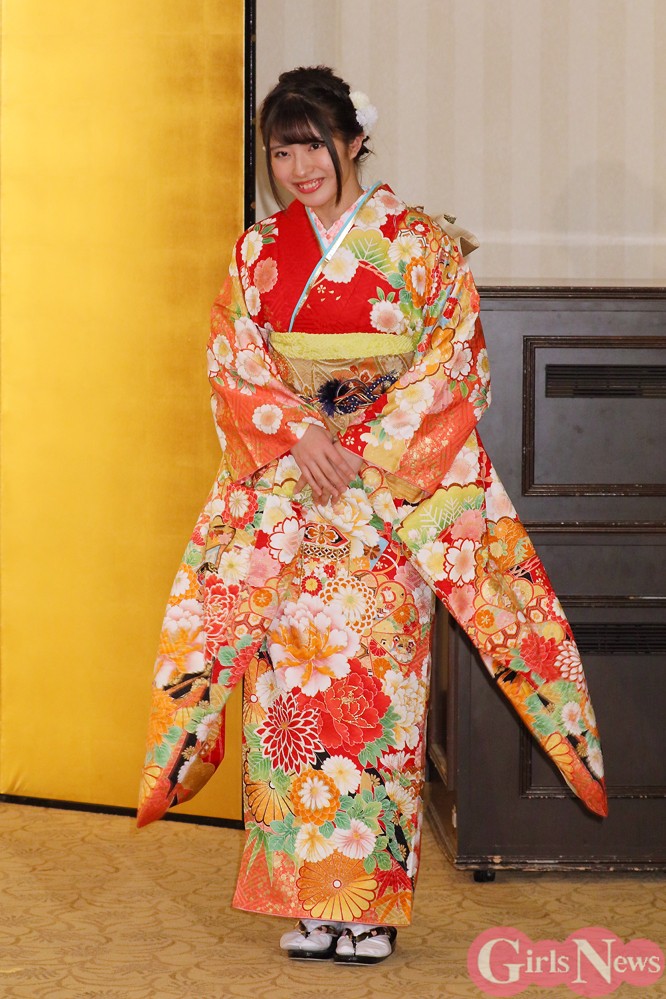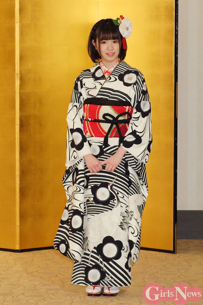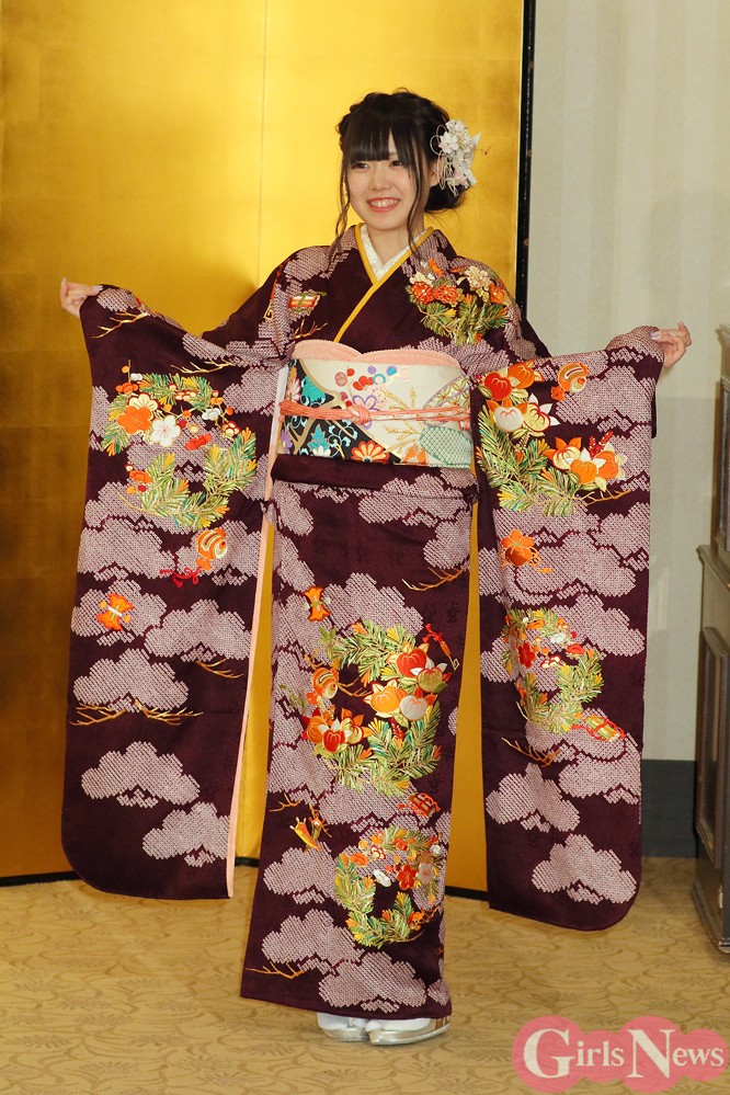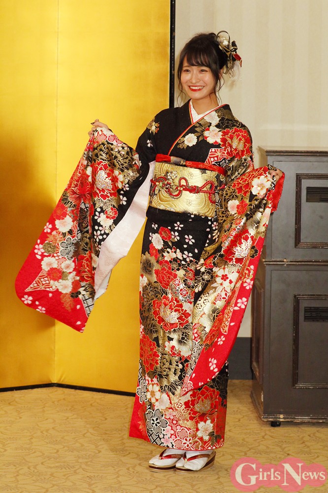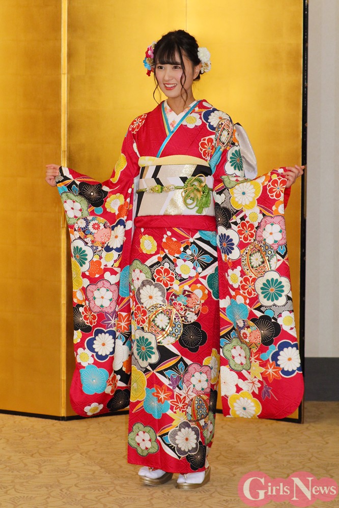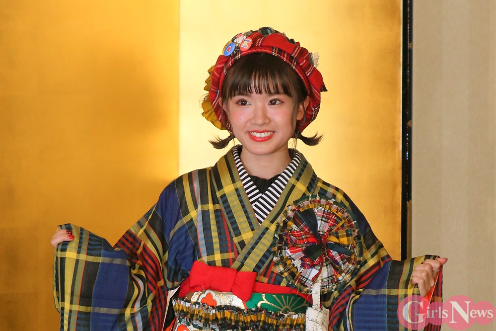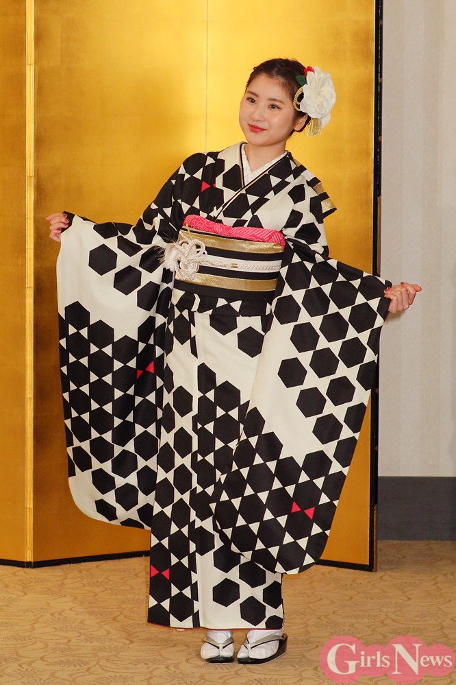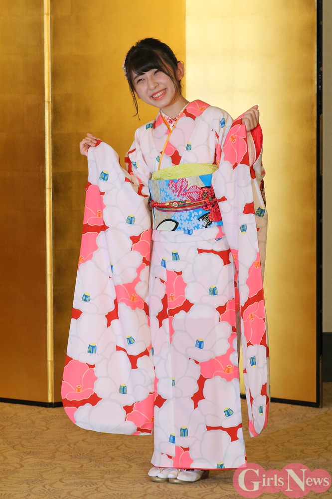 HKT48の外園葉月は、半年近くかかって姉と自作したという振り袖を披露。「費用は3000円くらい」と明かすと周囲からは「すごい!」と驚きの声が上がった。低予算ながら帯なども凝っていて、「帽子もお気に入りです」と照れながらも満足そうだった。