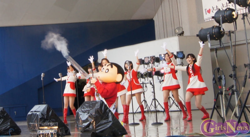 渡り廊下走り隊7の9thシングル「希望山脈」がアニメ「クレヨンしんちゃん」のオープニングテーマということもあり、最後に「希望山脈」をもう1度披露すると、曲の途中からクレヨンしんちゃんがサプライズで登場し、メンバーも喜びの表情を見せていた。