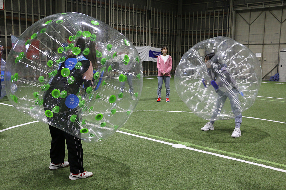 STU48から見れば、HKT48メンバーはアイドル界の大先輩。STUメンバー一同、恐縮しっぱなし…かと思いきや、対決前から予想外の舌戦も繰り広げられ、進行役を務めるここあ(甲斐心愛)のMCに、HKT48メンバーからの容赦ないツッコミが炸裂するなど、かつてない激しい戦いが幕を開ける。1試合目では、全身が透明のクッションで覆われたバラエティー番組でお馴染みの「アレ」で、ぶつかり合う。