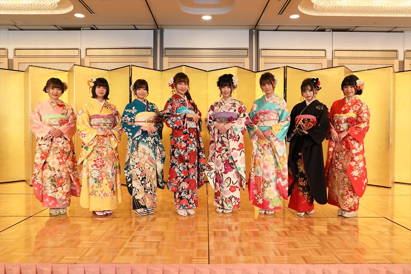 今年の新成人は、7期生~10期生のメンバー8名。それぞれお気に入りを選んだという華やかな振袖に身をつつみ、清々しい早朝、厳かな雰囲気の中で祈祷が行われた。撮影後の取材ではこれからやってみたいこととして、青海ひな乃はボートレース、北川愛乃は、ファンと生配信アプリ上での飲み会、太田彩夏は競馬のお仕事、中野愛理は初シャンパン、田辺美月はさらなる大食いチャレンジ、竹内ななみは初ビキニでのグラビア撮影、池田楓は車の免許取得とバラエティーでのお仕事、西井美桜はツマミに合うお酒を飲むなどと、希望を語った。