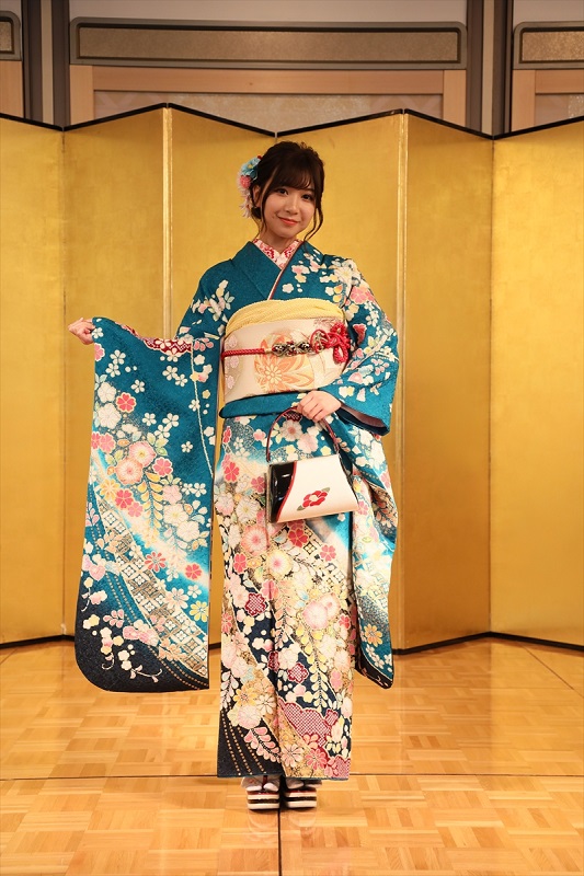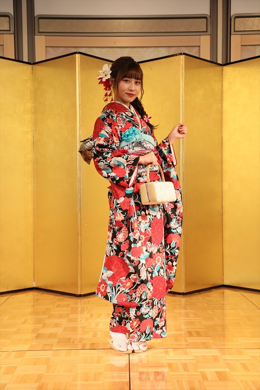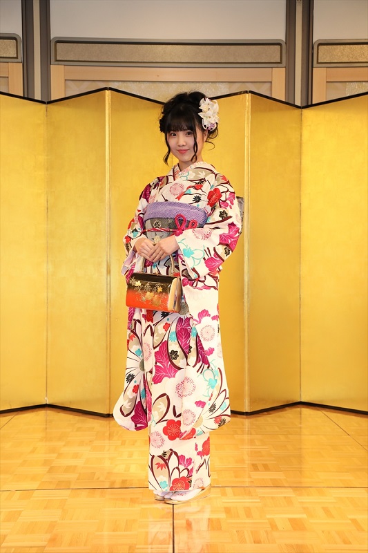 地元の成人式では白の古典柄の振袖を着るので、SKE48の方では現代的な柄を選ばせていただきました。