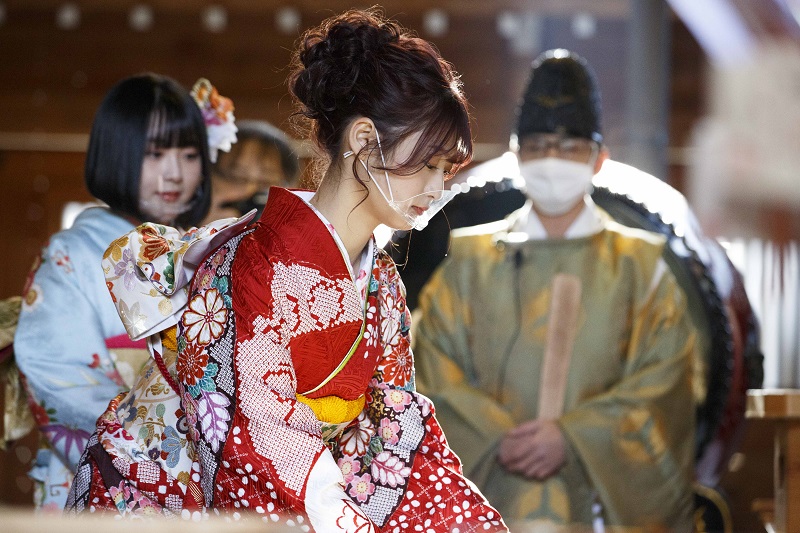 それぞれが選んだ艶やかな振袖に身をつつんだメンバーたちは、フェイスシールドを着用し、少し緊張気味に神殿入り。新成人として健やかに過ごせるようご祈祷を受けた。ご祈祷後は、神殿と飾り山笠を前に記念撮影。新成人を代表し、11歳でHKT48に加入した2期生の秋吉優花さんは「成人式が延期や中止となっている中で、こうして成人式を執り行うことができて、櫛田神社の皆様や関係者の皆様、そして私たちの健康や安全を支えてくださっている医療従事者の皆様に感謝申し上げたいと思います」と話し、「HKT48は今年10周年を迎えるので、いつも応援してくださっている方に感謝を伝える1年にしたいですし、まだ私たちのことを知らない方にも、好きになってもらえるようにこれからも頑張っていきたいと思います」と挨拶した。