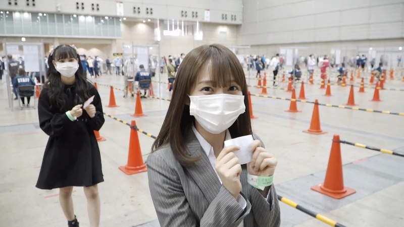体験レポートを担当したのは、Team E髙畑結希さんと末永桜花さん。新型コロナウィルスの感染対策として、会場の入り口にある消毒マットが設置されている模様や、サーモグラフィーによる検温実施、問診票提出と手の消毒を終えてリストバンドを受け取り入場。