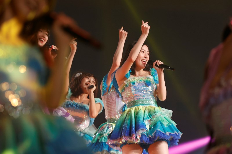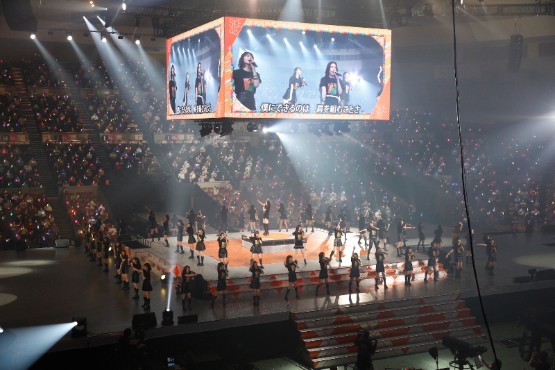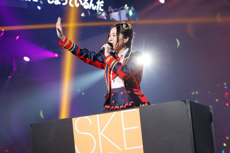 メンバーが松井さんとの思い出話を語ったMCに続き、カラフルなスパンコールの衣装で登場した菅原茉椰さんの「まずはサイリウムを準備してください。行きますよー!」の呼びかけから『オキドキ』がスタート。『1!2!3!4!ヨロシク!』、『パレオはエメラルド』とSKE48の代表曲が続々と繰り広げられる。熊崎晴香さんの「SKE48の未来はずっとずっと明るいです。今という瞬間を大切にして明るい未来を作っていくぞー!」と宣言し『未来とは?』を歌うと、『前のめり』では事前にファンから募集したコールが会場に響きわたり、ステージ上のメンバーの表情も一層輝いた。