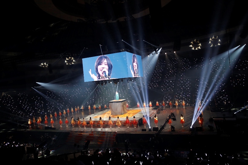 「珠理奈さんが私たちに残してくれたものは本当に大きくて、これから珠理奈さんのいない穴をどう埋めていったらいいか、珠理奈さんの背中を見てきた私たちだからこそ、一番強い気持ちでそれを思っています。ですが、珠理奈さんはみんなに頑張ってねというエールをいつも心から送ってくれて、そのエールに励まされて今日もこのステージに立つことができました」という、松井さんの卒業後、一番初期のメンバーとなる斉藤真木子さんの言葉の後、松井さんが緑のドレスで登場。自身が作詞した卒業ソロ曲『Memories~いつの日か会えるまで~』を心を込めて届けた。ステージ下にはオレンジ色の衣装を身につけたメンバーが集まり、ステージ上も会場のサイリウムもオレンジと緑に染まりました。そして「世界中の皆様に私たちの大好きを伝えたいと思います」と、「大好き」を世界のさまざまな国の言葉で歌い、『僕は知っている』を披露後、松井さんからの挨拶に。