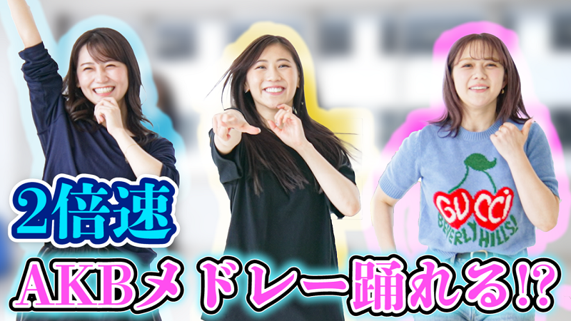 今回の動画では、3人がランダムに流れてくるAKB48 楽曲の2 倍速ダンスに挑戦し、誰が一番上手く踊れるか、検証するという企画。まずは大ヒット曲『ヘビーローテーション』が流れ始めると、現役アイドルの村重さんはニコニコ笑顔で、素早い動作のキレッキレダンスが現役当時話題を呼んだ西野さんは本気のダンスで周囲を爆笑の渦に巻き込みむ。小嶋さんはしなやかな動きを見せつつも、音楽が進むにつれて雲行きの怪しい動きに…!? 曲が変わる度、まるでスイッチを切り替えたかのように踊り続け、『大声ダイヤモンド』『フライングゲット』『真夏のsounds goods!』を踊り終えたあたりで限界を迎え「苦しい」「吐きそう」と漏らしながらついには倒れ込む場面も。